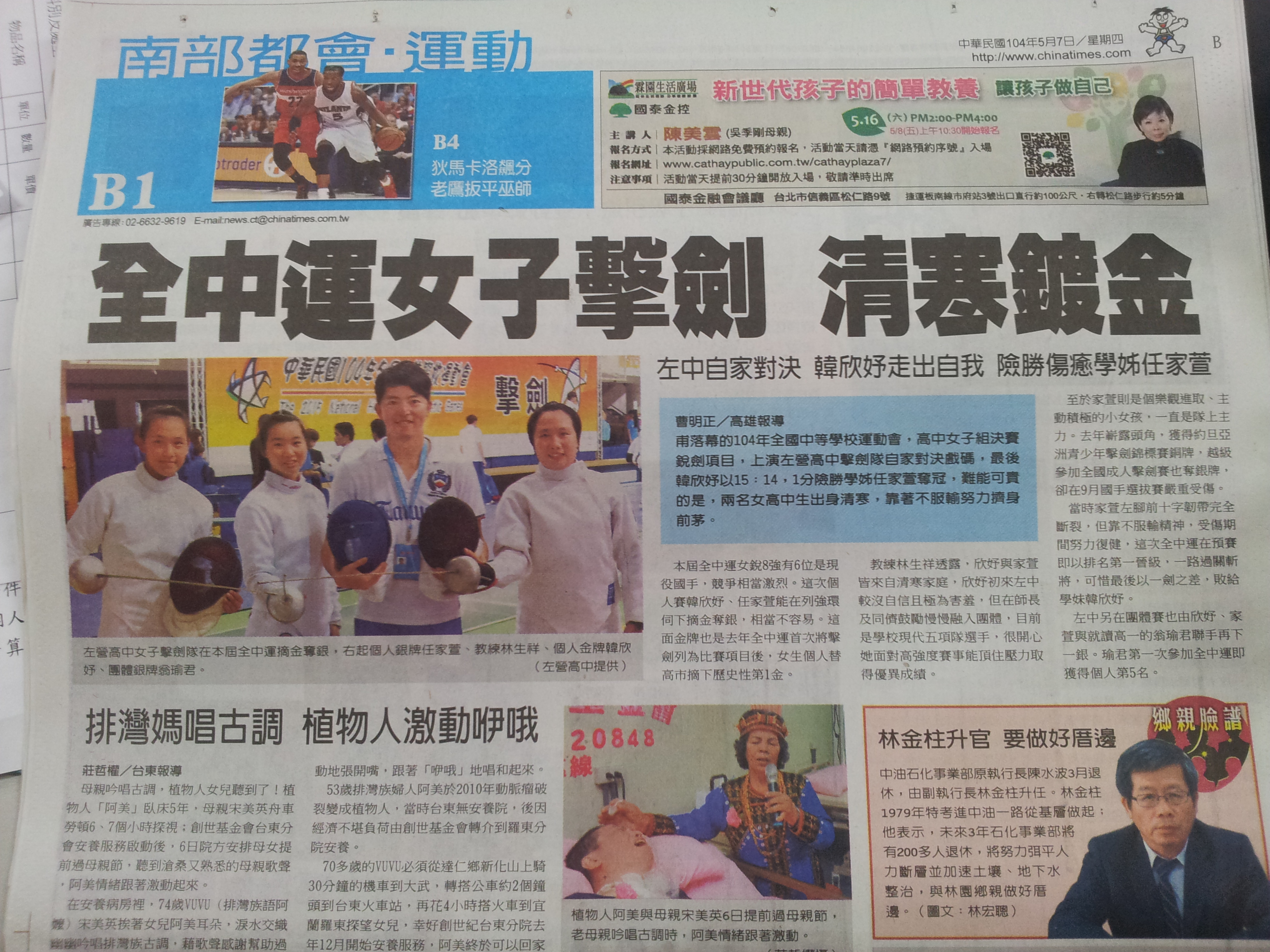 | 2015/05/08 中國時報 104全中運擊劍 左營高中包辦女子銳劍金銀 |