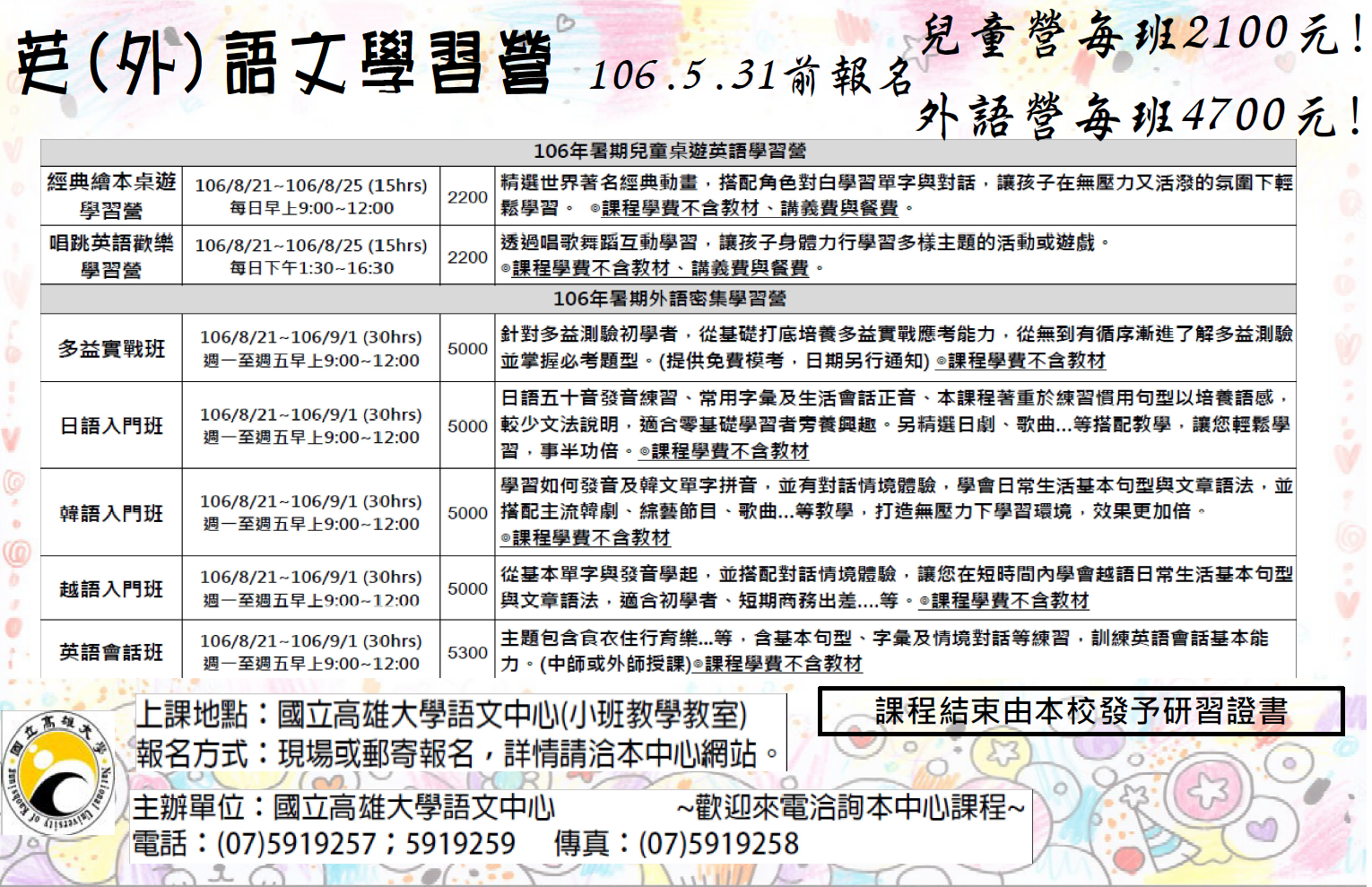 國立高雄大學語文中心「2017暑期孩童英語-繪本桌遊與唱跳英語歡樂學習營」及「2017暑期外語學習營(英、日、韓、越)」課程表及報名表