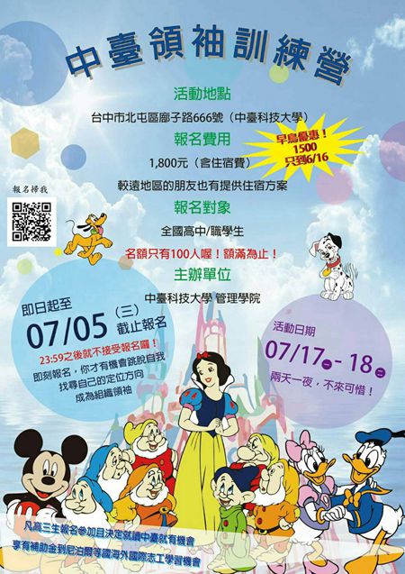 中臺科技大學管理學院訂於106年7月18日(星期一)至7月19日(星期二)舉辦「第三屆中臺領袖營」
