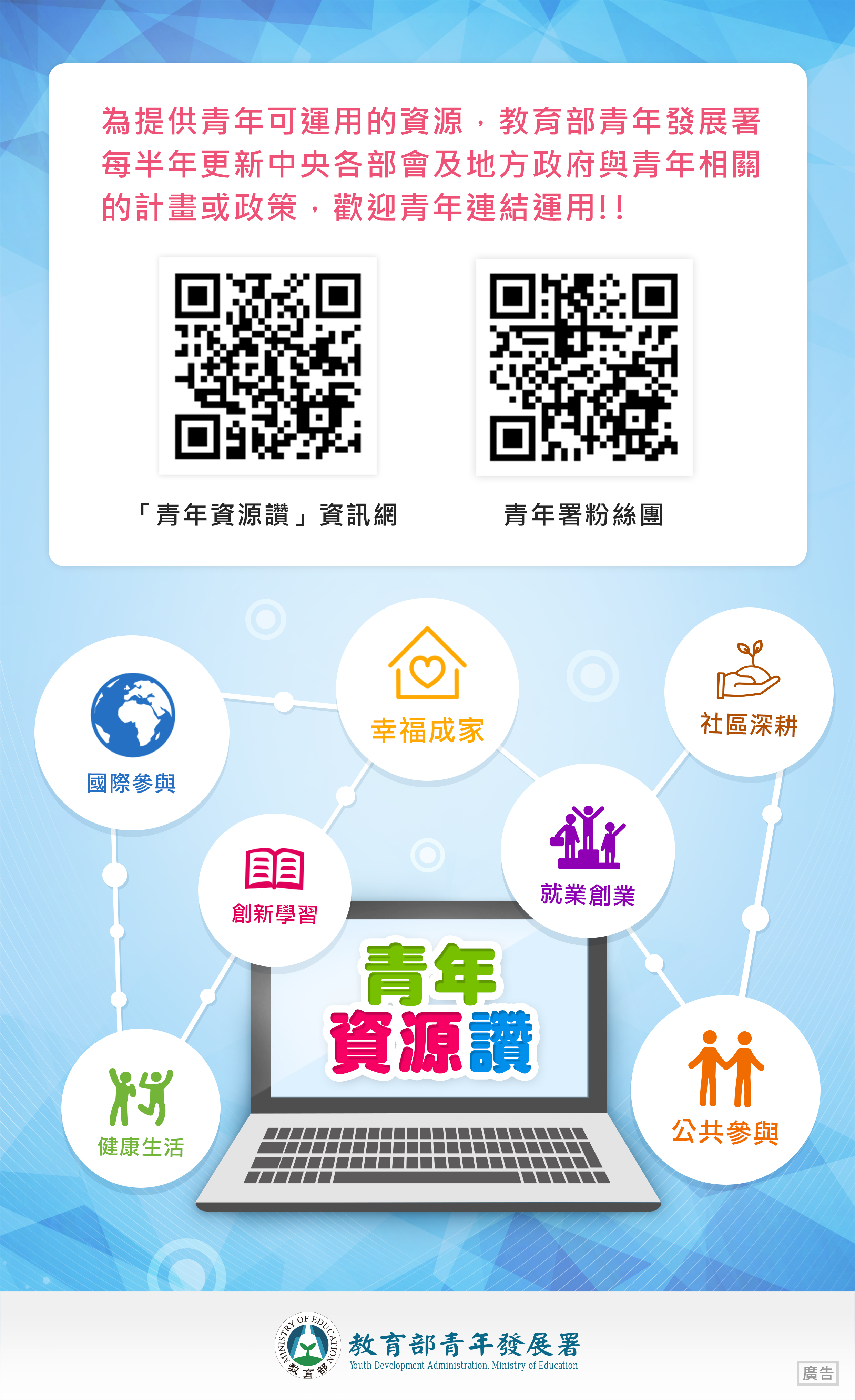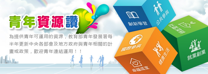 一、為提供青年可運用的政府資源,本署每半年彙整與更新中央各部會、直轄市及縣(市)政府與青年有關的計畫或措施,並建置網頁專區,資源類別涵蓋「公共參與」、「創新學習」、「就業創業」、「國際參與」、「健康生活」、「幸福成家」及「社區深耕」等7大類,期望讓青年學子能快速且完整的取得相關資訊,並能加以運用。