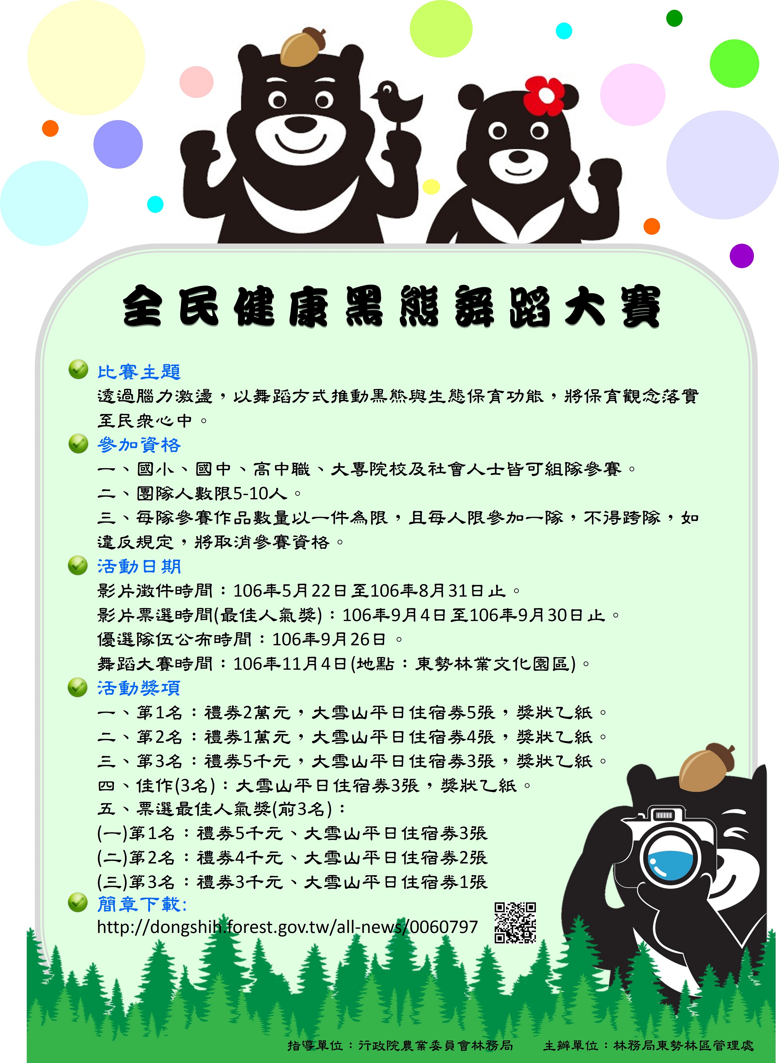 | 2017/06/12 行政院農業委員會林務局東勢林區管理處檢送「全民健康黑熊舞蹈大賽」活動簡章 |