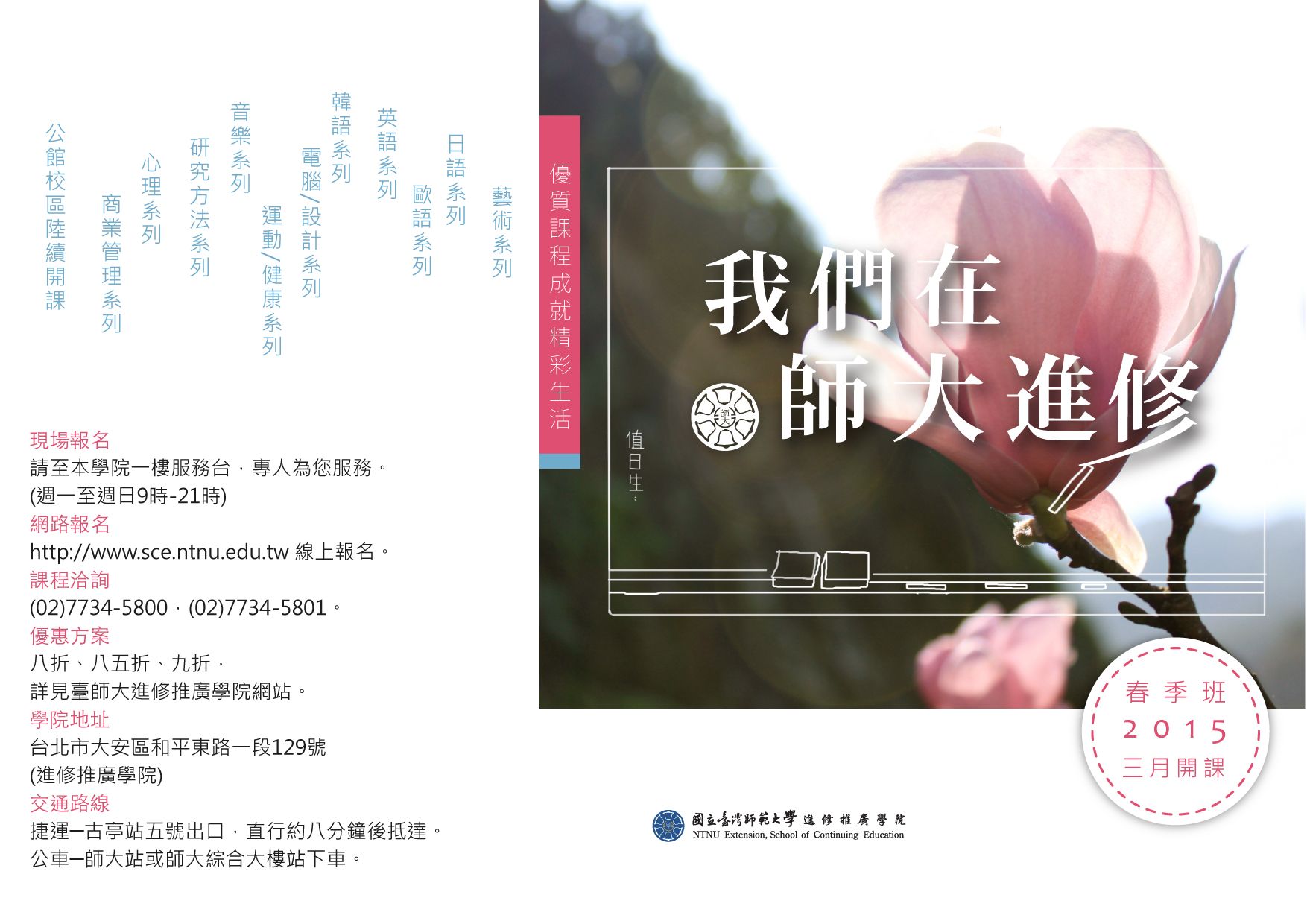 | 2015/03/02 國立臺灣師範大學進修推廣學院辦理「104年度春季推廣非學分班」招生訊息 |