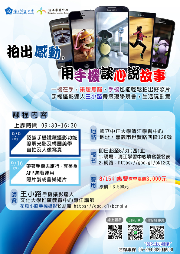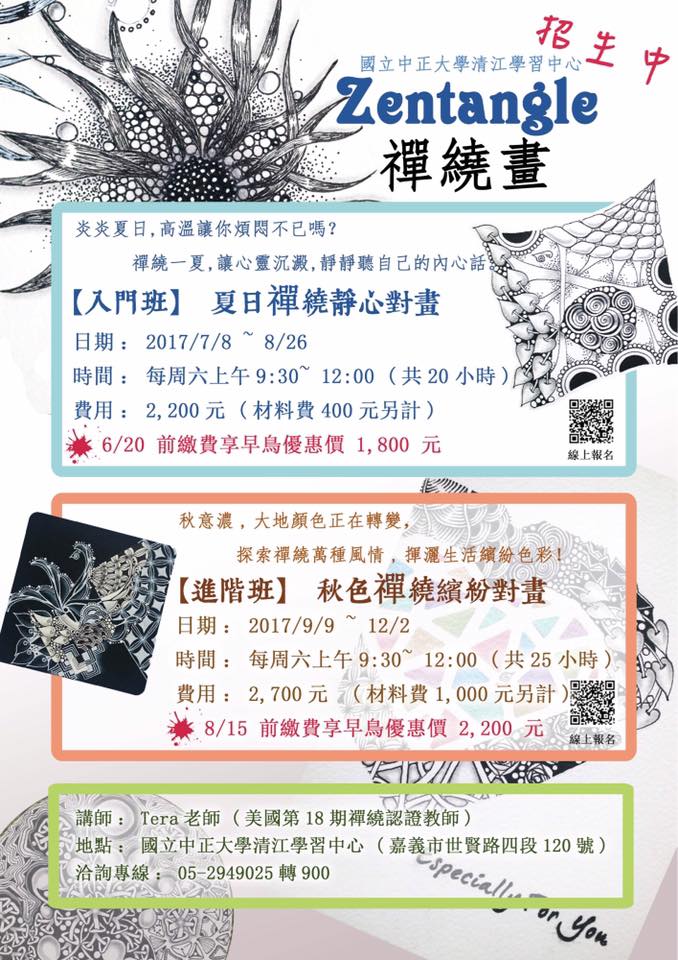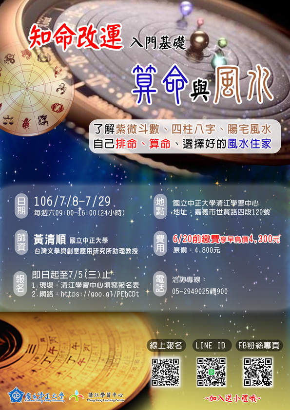 | 2017/06/21 檢送國立中正大學辦理「知命改運-命與風水入門基礎班」、「禪繞畫」、「拍出感動,用手機談心說故事」等課程之招生海報 |