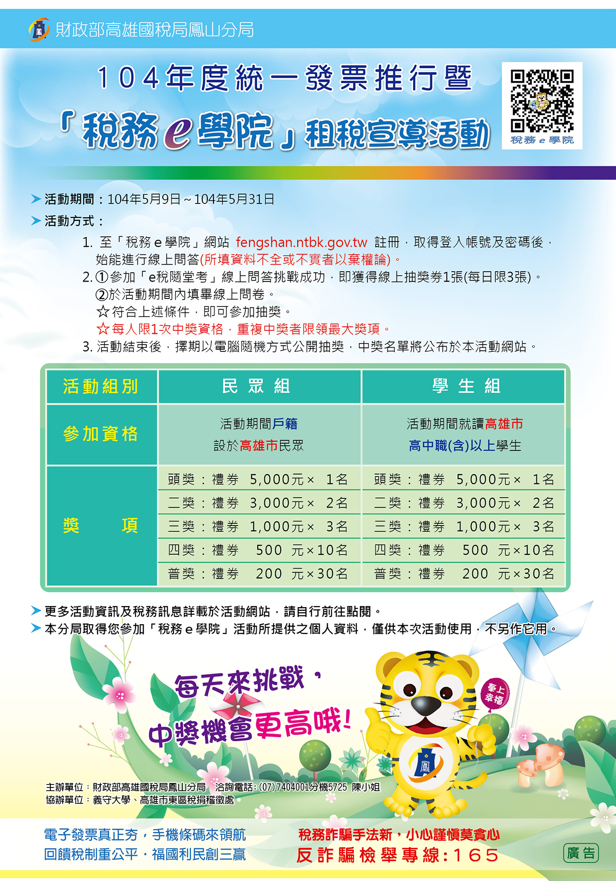 | 2015/05/13 高雄國稅局鳳山分局舉辦104年度統一發票暨「稅務e學院」租稅宣導活動,請同仁或學生踴躍參加。 |