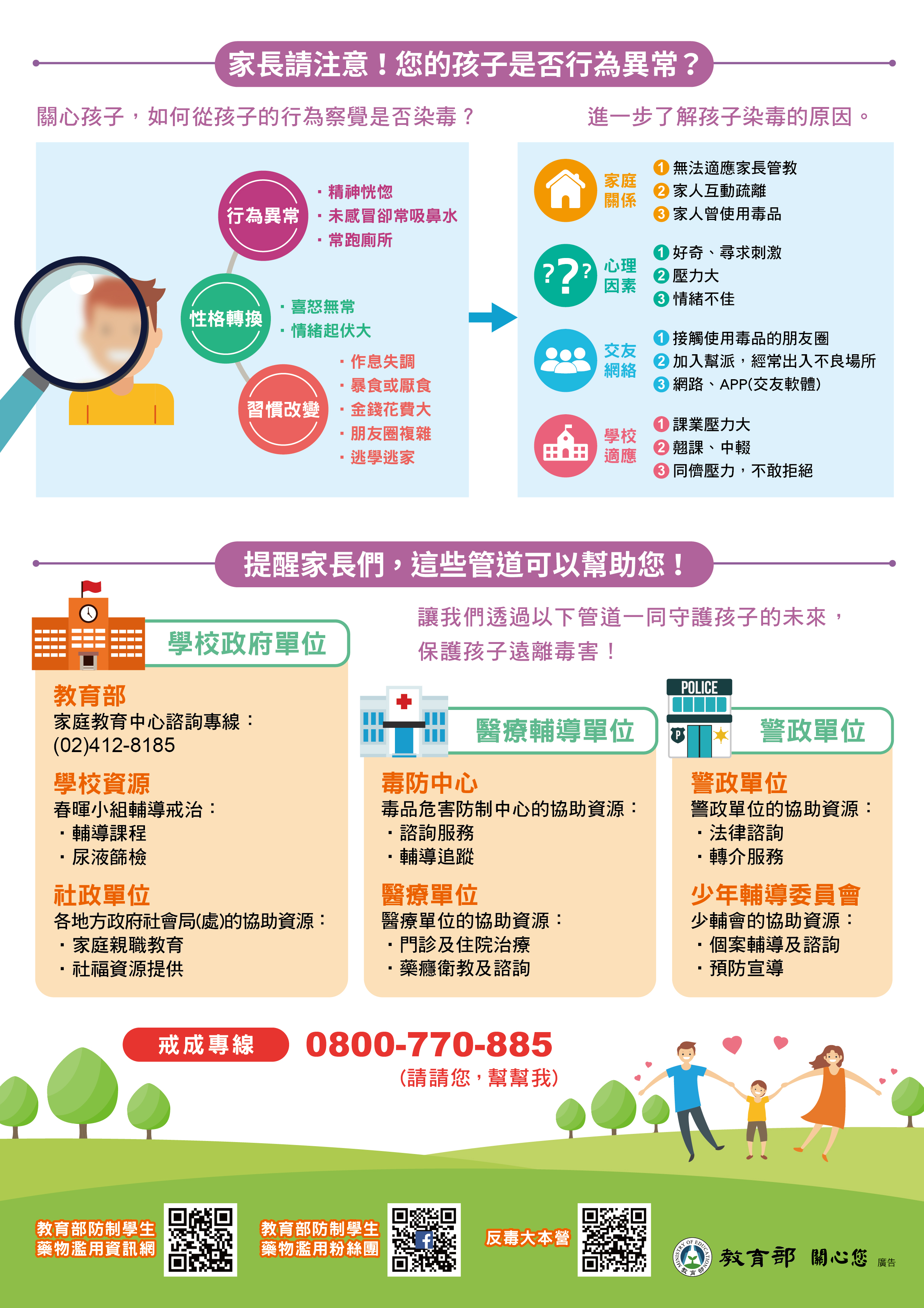 三、暑假家長反毒宣導單張電子檔,請至教育部防制學生藥物濫用資源網「文宣專區」下載運用(網址http://140.111.34.154/Poster)。