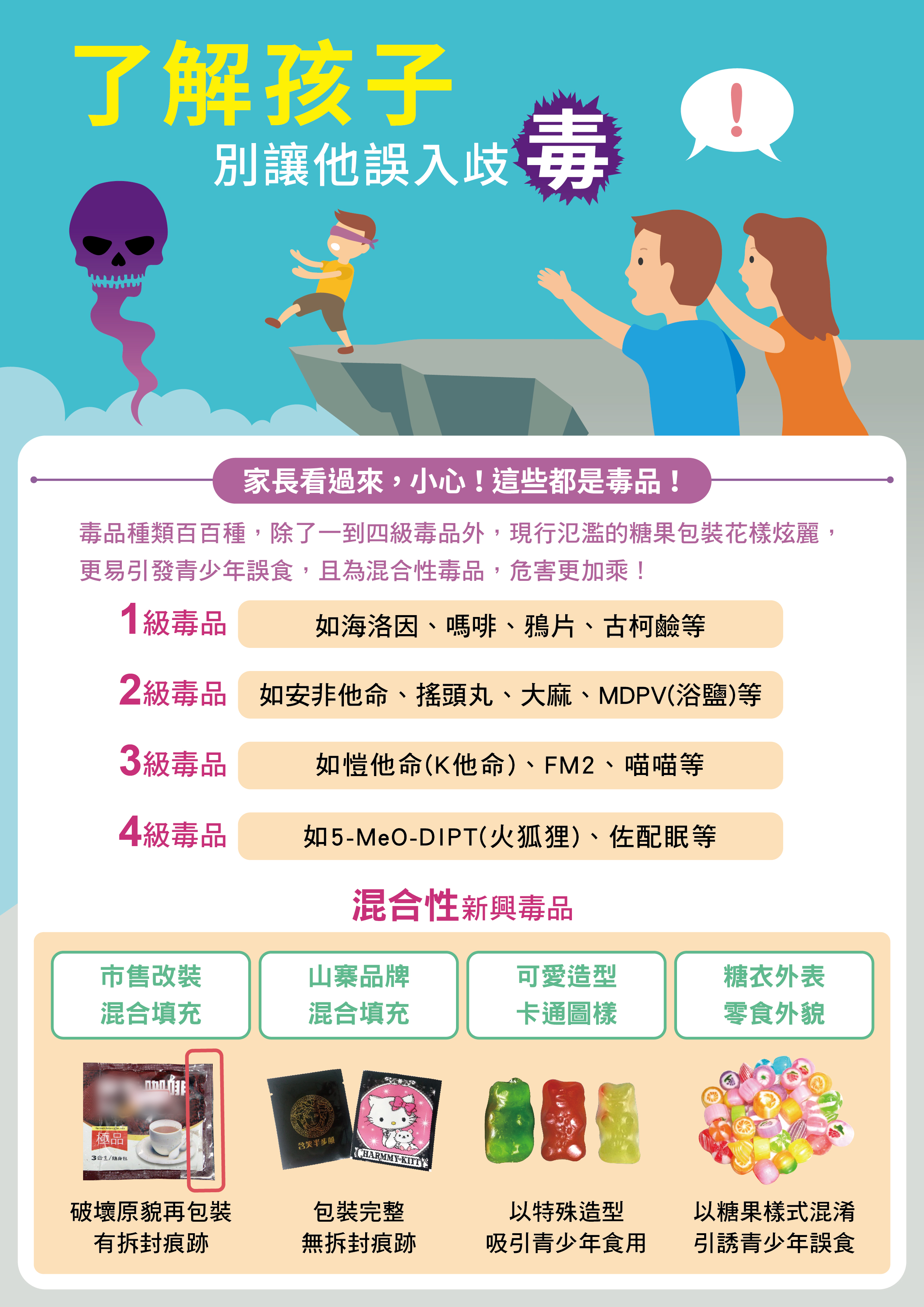 二、旨揭單張,請學校於暑假前印製完成並交付學生攜回轉交家長,提醒家長關心孩子並提供家長毒品防制相關資訊;另請學校於開學第1週配合友善校園週,宣導單張內容「混和性新興毒品辨識」,以提升學子反毒知能並提醒同學遠離毒害。