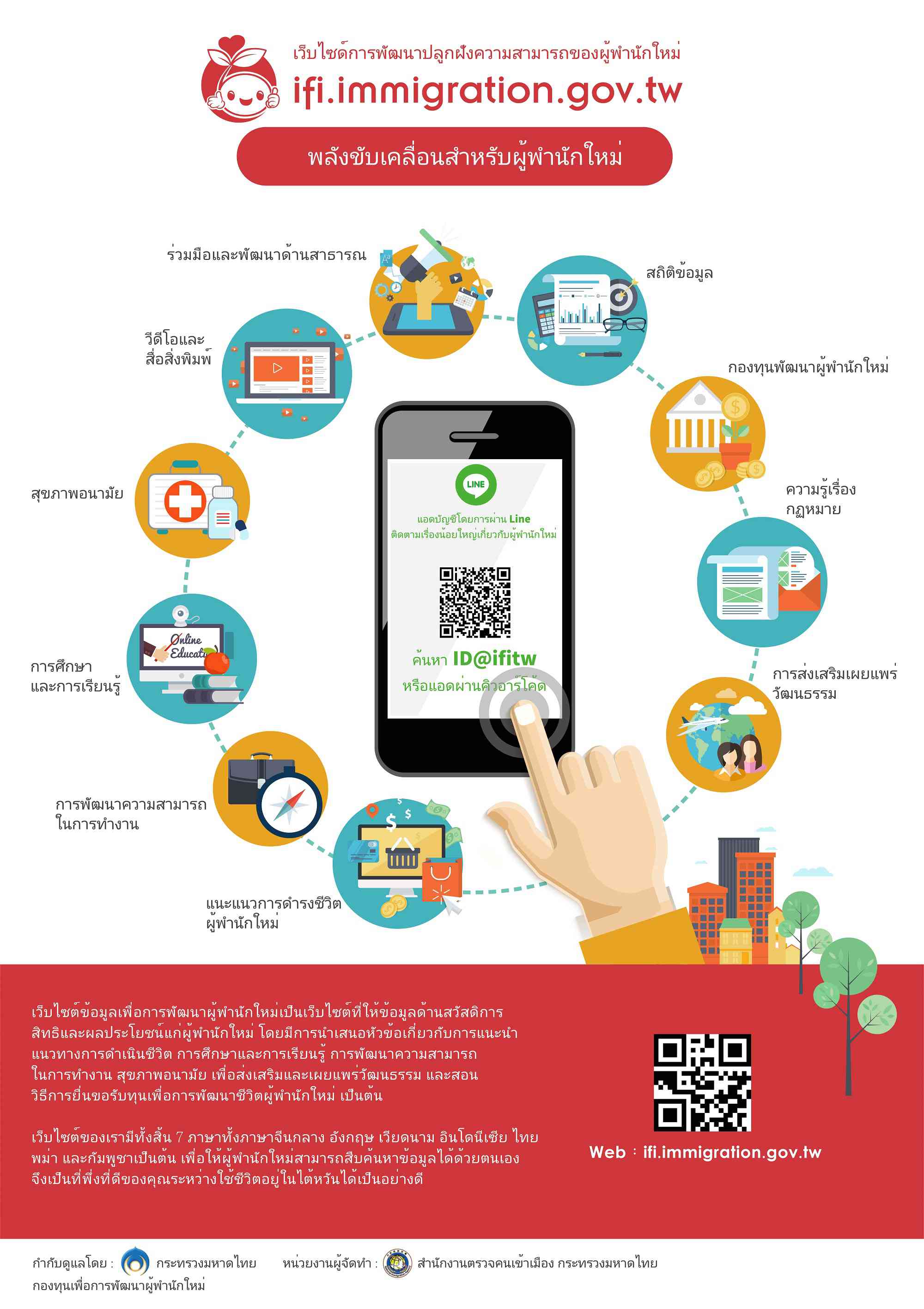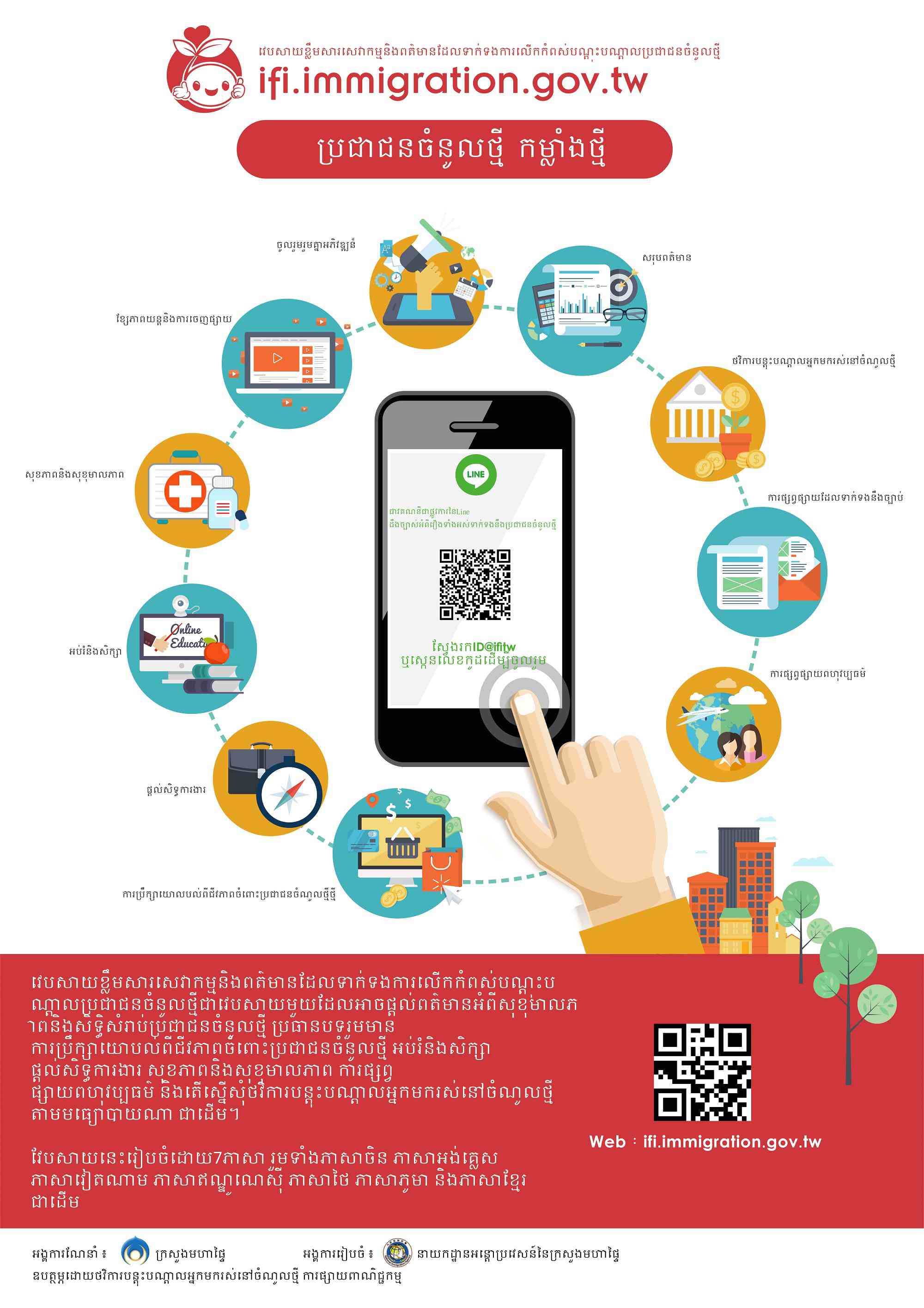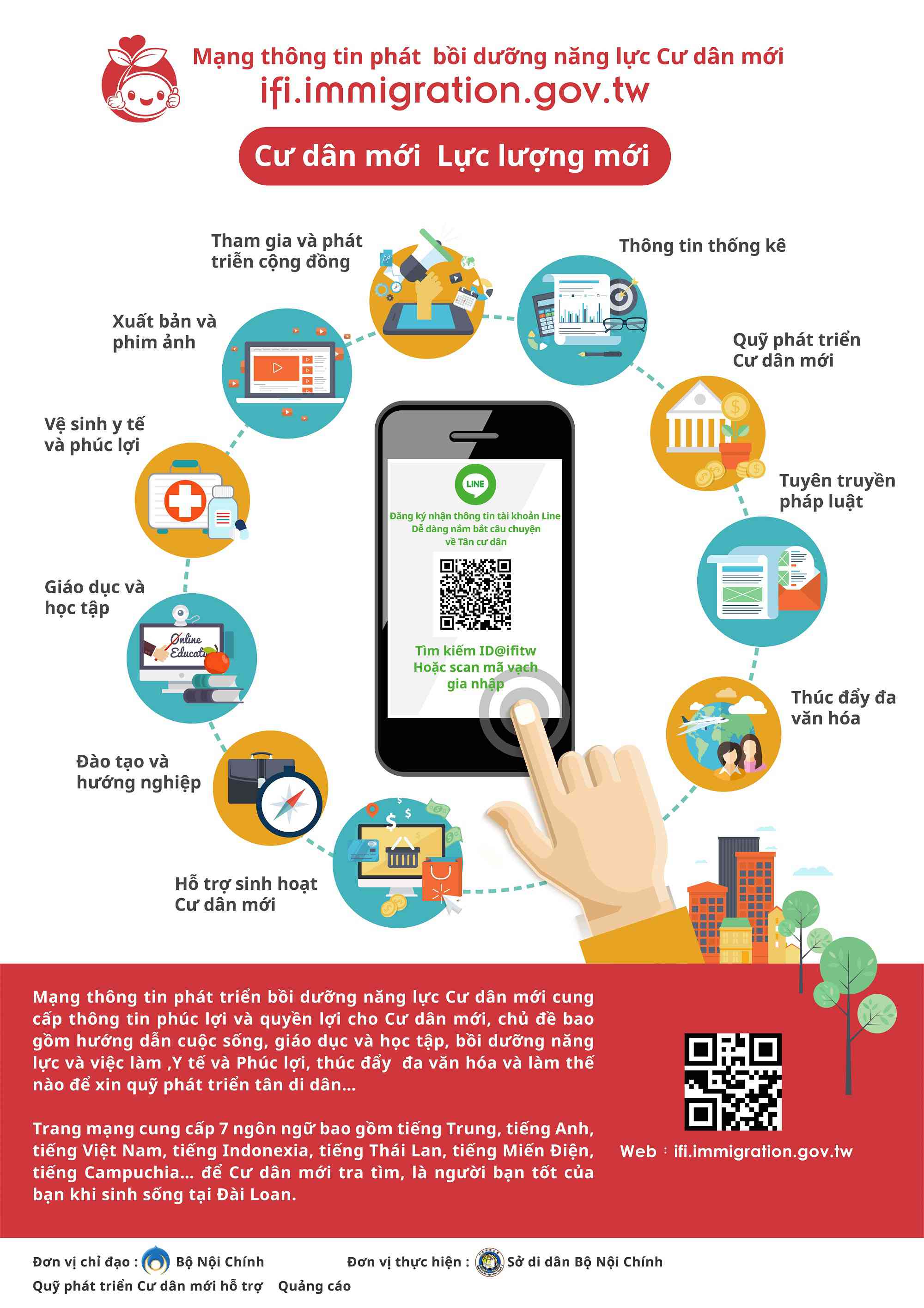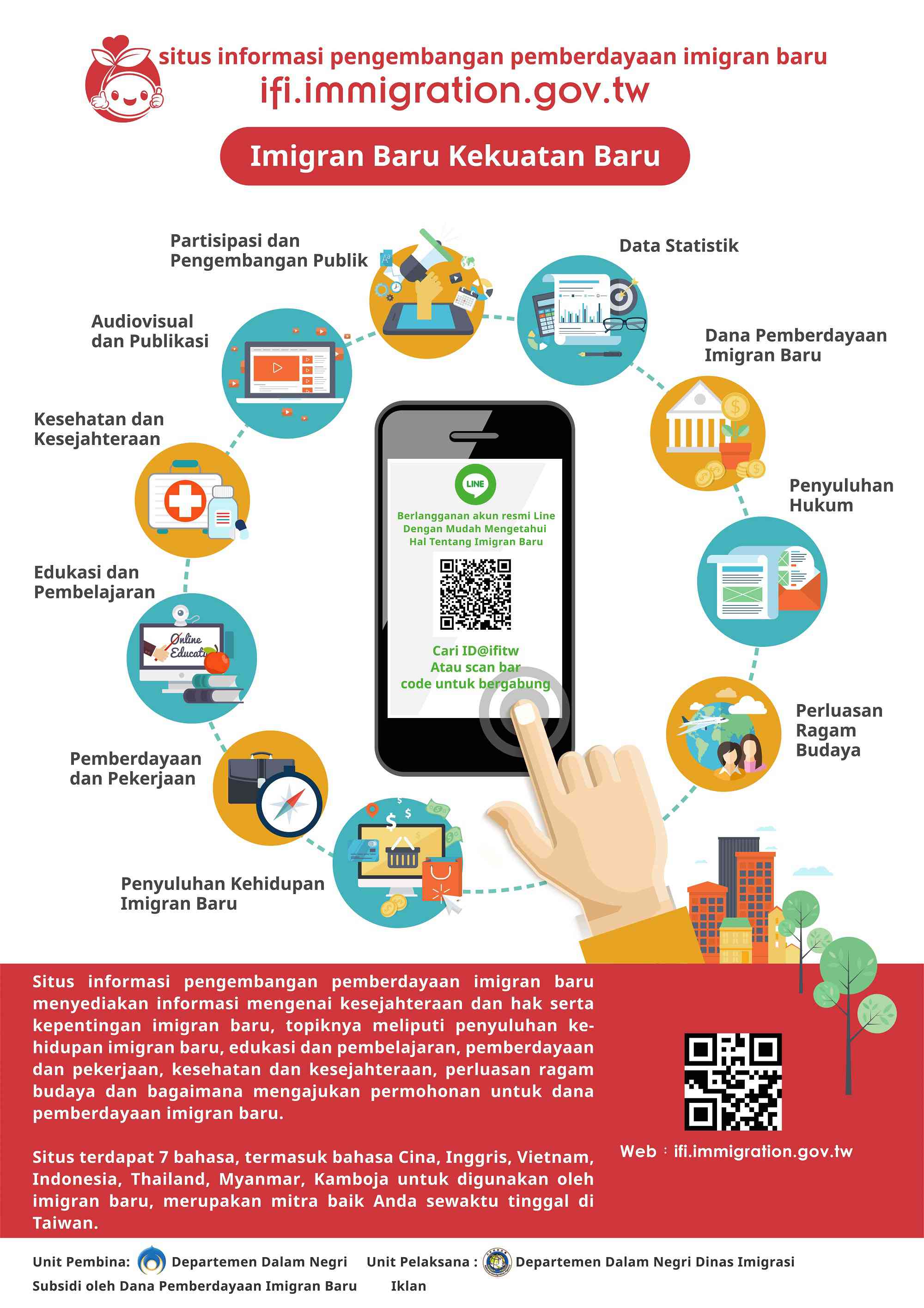 三、為有效提升網站宣導效益,該署設計及製作多國語版EDM,請協助宣傳,並鼓勵民眾利用該網站及加入Line官方帳號(ID為@ifitw),俾利各界與新住民家庭獲取政府各類資訊。
