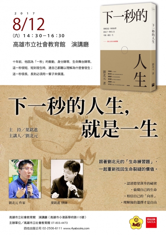 | 2017/08/07 高雄市立社會教育館106年8月12日辦理<知名作家>劉北元主講,<知名律師>葉銘進主持「下一秒的人生,就是一生」講座 |