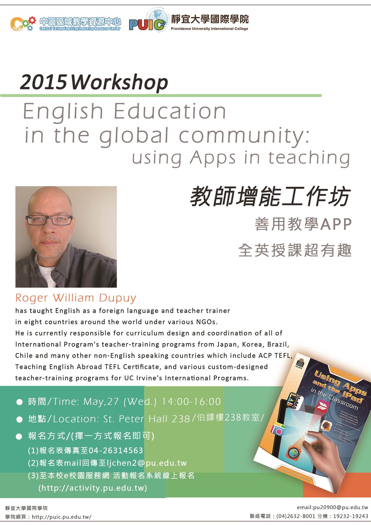 主旨:靜宜大學將舉辦「2015教師增能工作坊-善用教學APP,全英授課超有趣」,惠請公告並鼓勵教職員生踴躍參加。