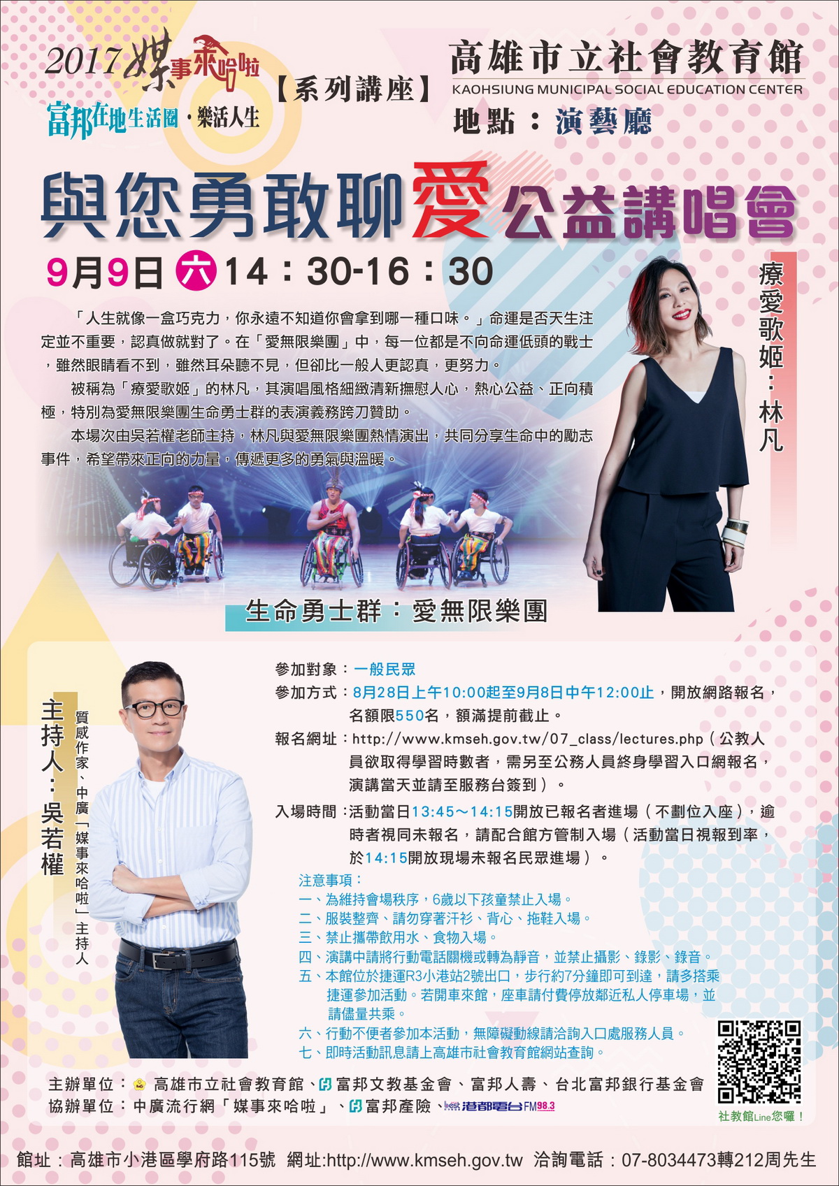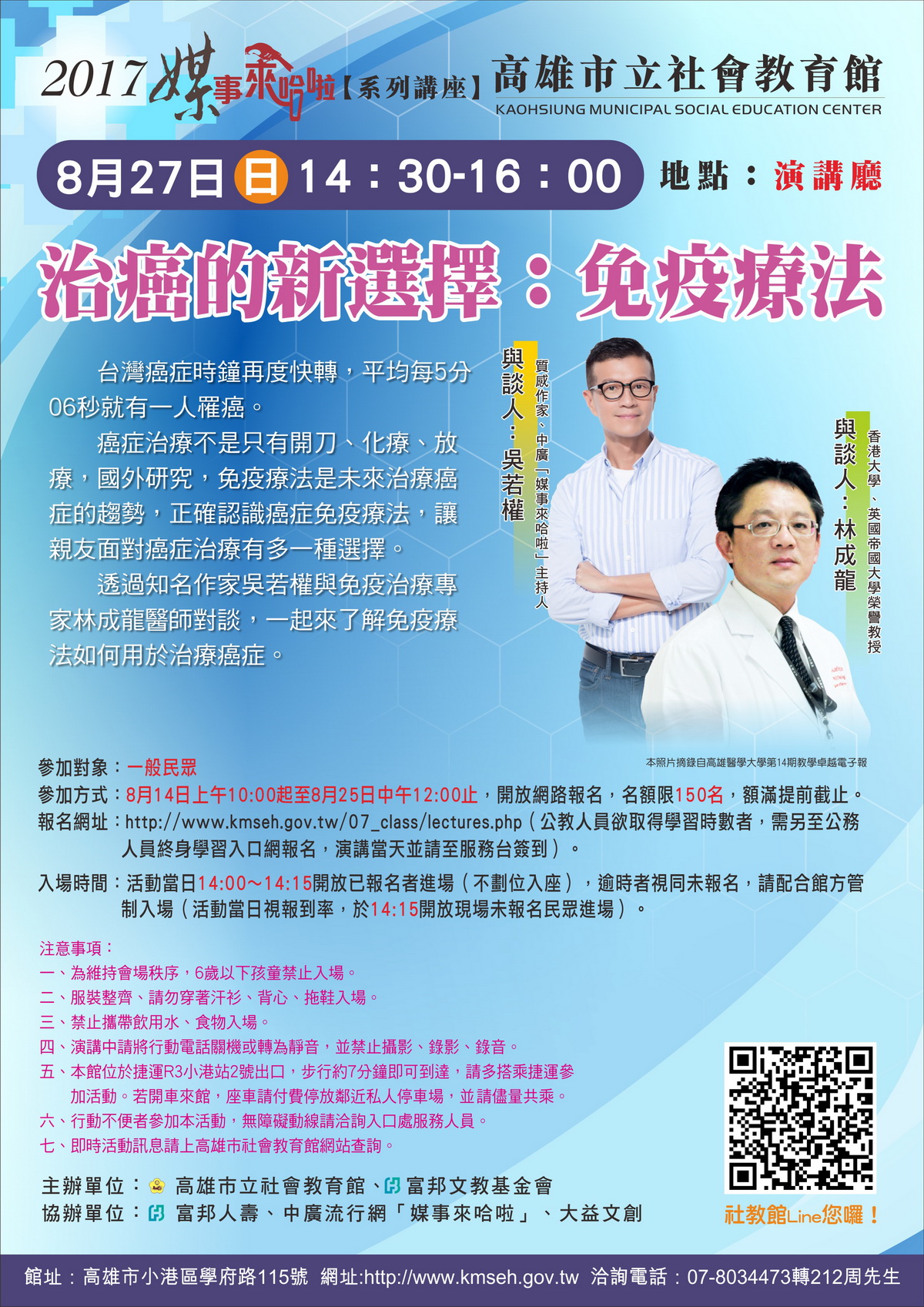 | 2017/08/15 轉知高雄市立社會教育館辦理「治癌的新選擇:免疫療法」講座與「與您勇敢聊愛,公益講唱會」 |