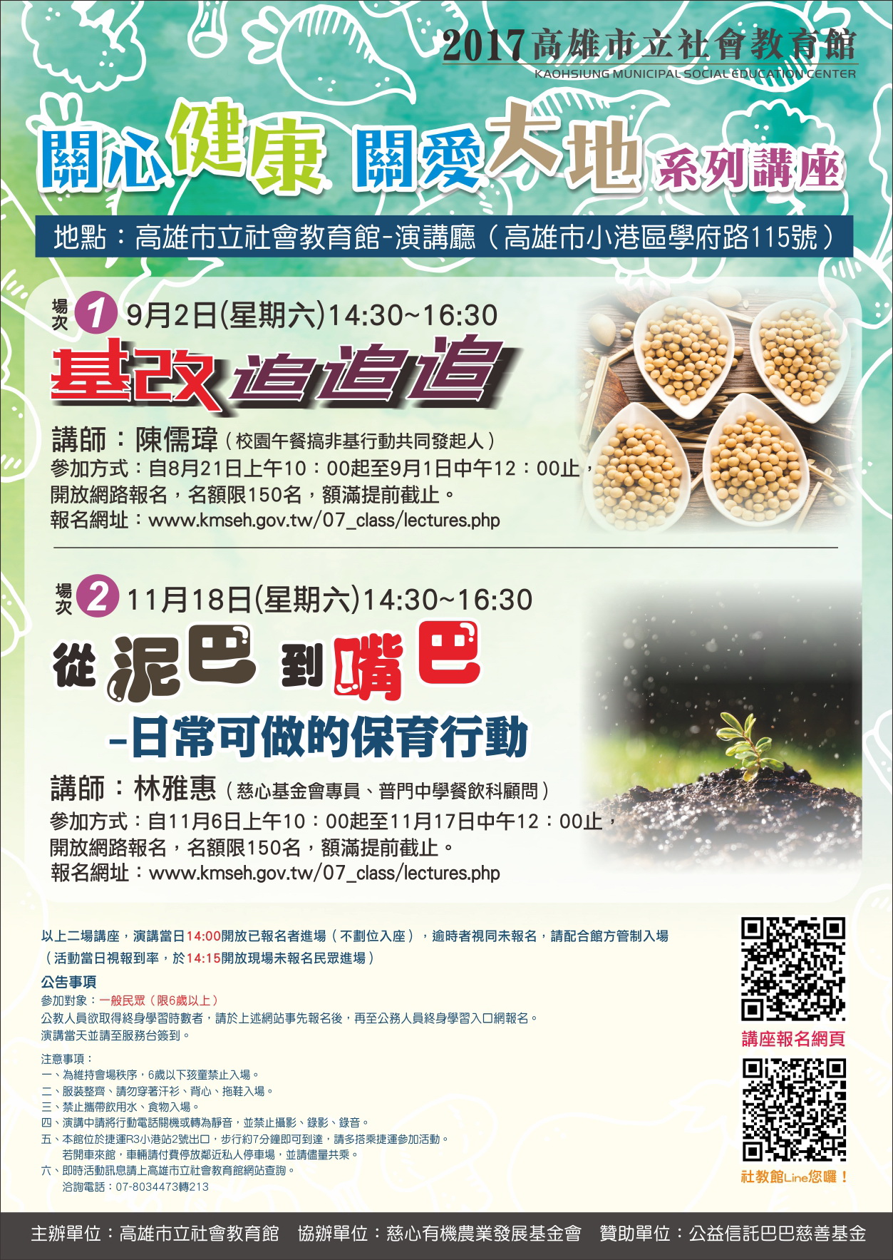 高市社教館講座:9月2日、11月18日,週六14:30~16:30,分別邀請陳儒瑋《校園午餐搞非基行動共同發起人》主講「基改追追追」; 林雅惠《慈心基金會專員》主講「從泥巴到嘴巴-日常可做的保育行動」,採網路報名,詳情請上該館網站查詢。
