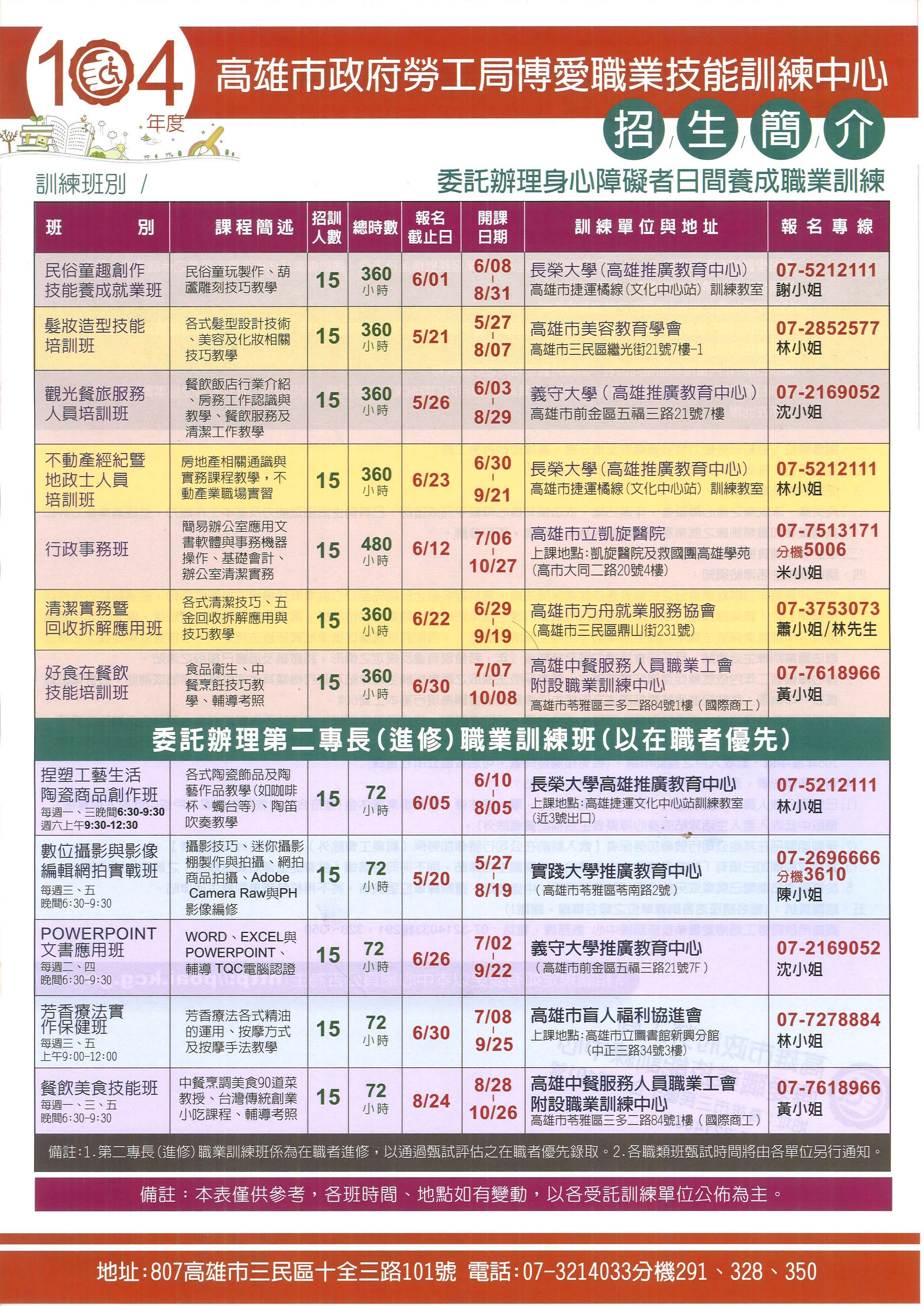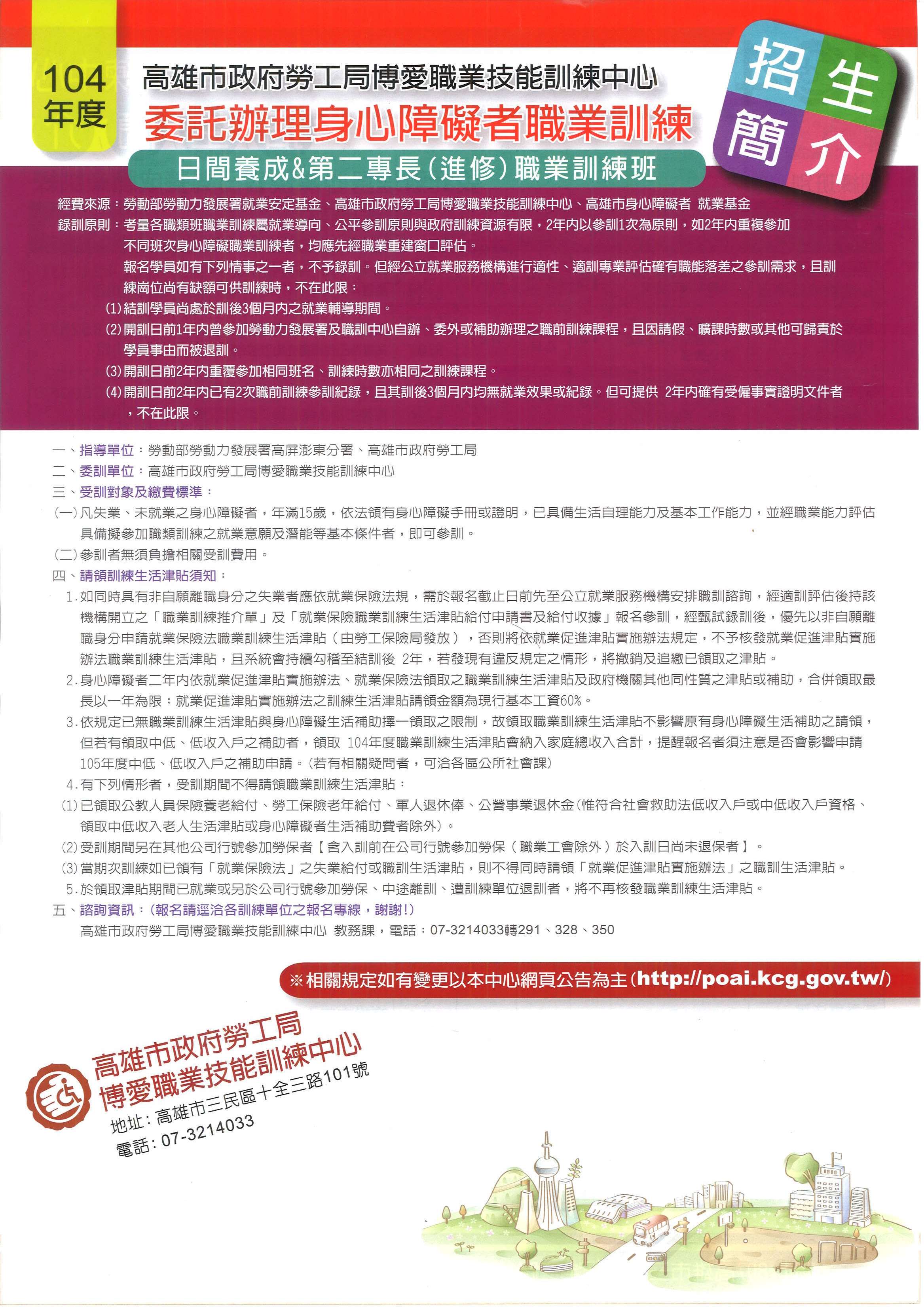 高雄市政府勞工局博愛職業技能訓練中心104年度辦理身心障礙者職業訓練班招生(詳如附件),概述如下,歡迎報名參加: