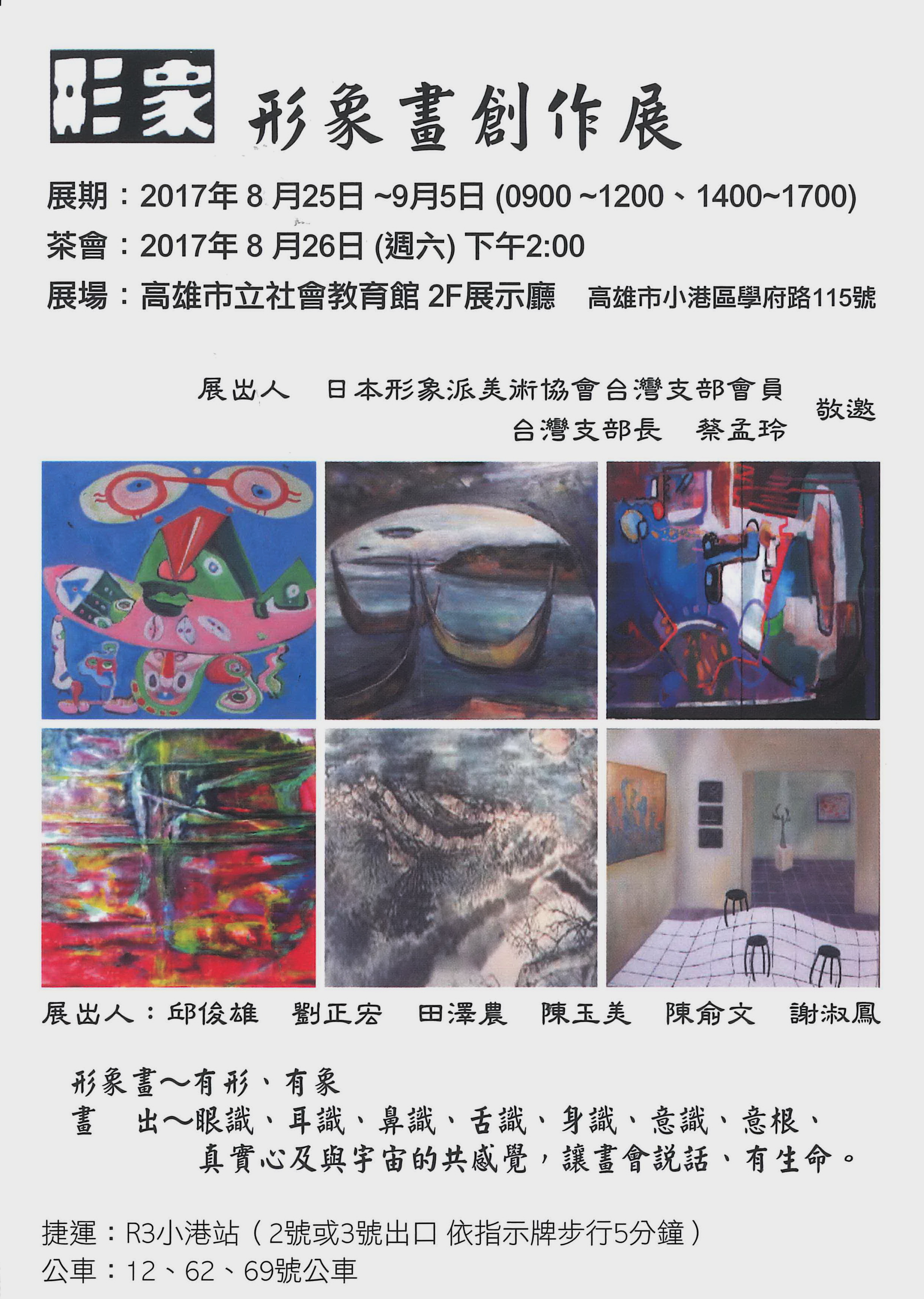| 2017/08/24 轉知106年8月25日至9月5日於高雄市立社會教育館展示廳展出「形象畫創作展」 |