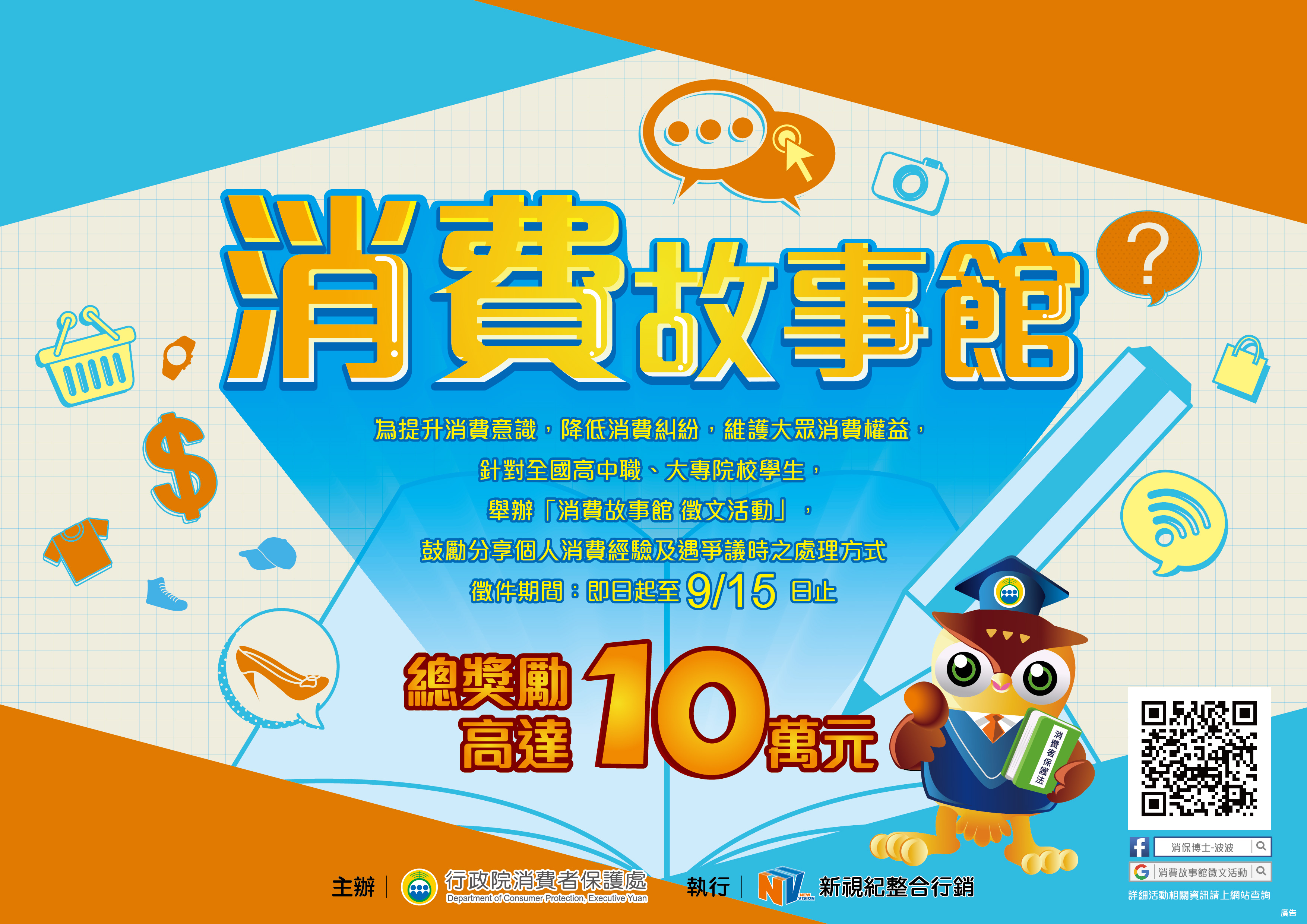壹、活動目的:為鼓勵學生重視消費者保護議題,並提升消費者保護意識,充實大眾消費權益,特舉辦「消費故事館 徵文活動」,號召學生分享個人消費經驗及遇到爭議時之處理方式,以瞭解消費者保護實務、困境與解決之道。
