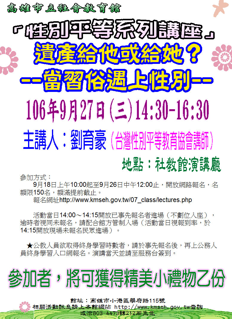 | 2017/08/30 轉知高雄市立社會教育館「認識失智症」與「遺產給他或給她?--當習俗遇上性別」講座 |