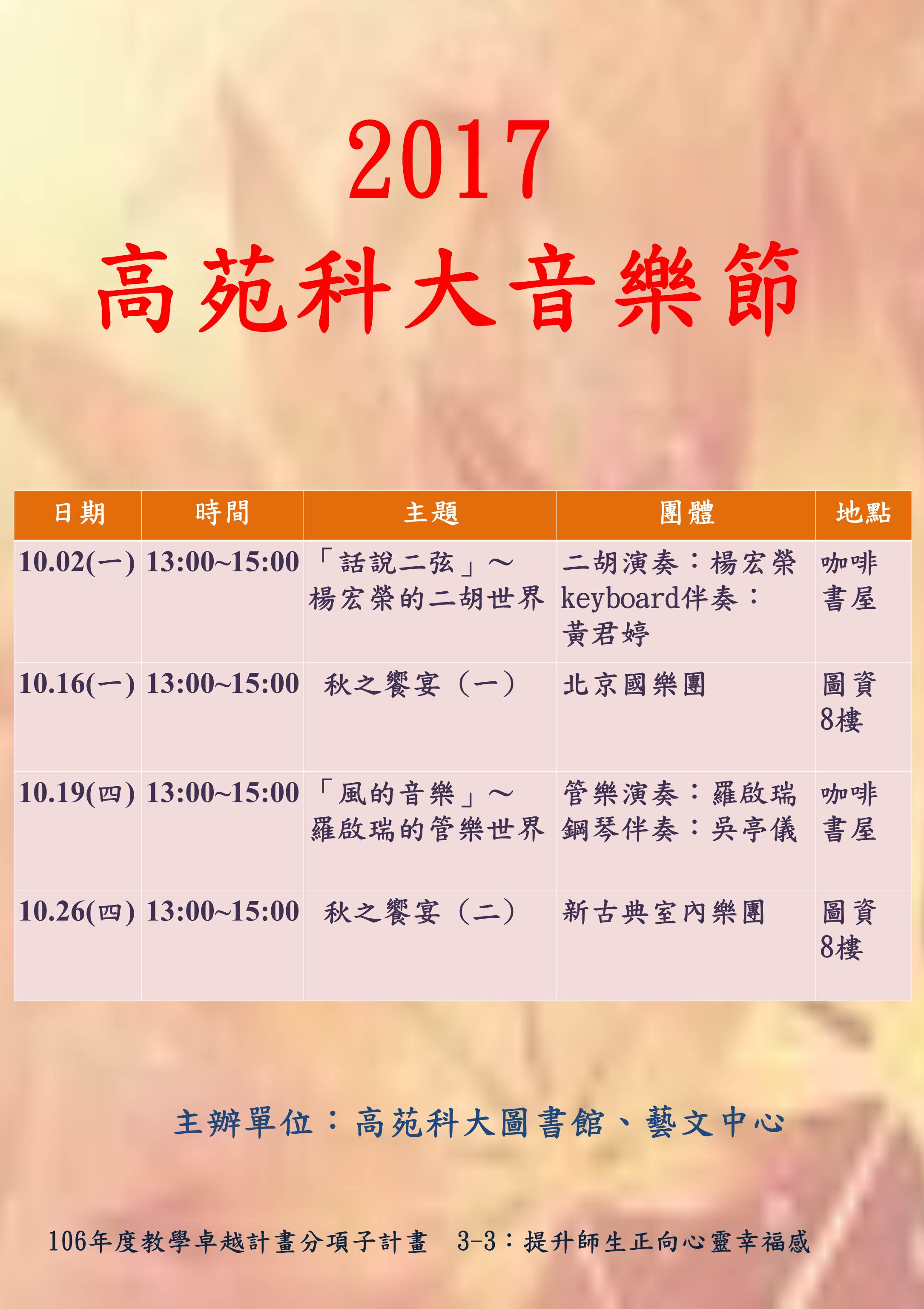 | 2017/09/05 轉知高苑科技大學辦理「2017高苑科大音樂節」活動 |
