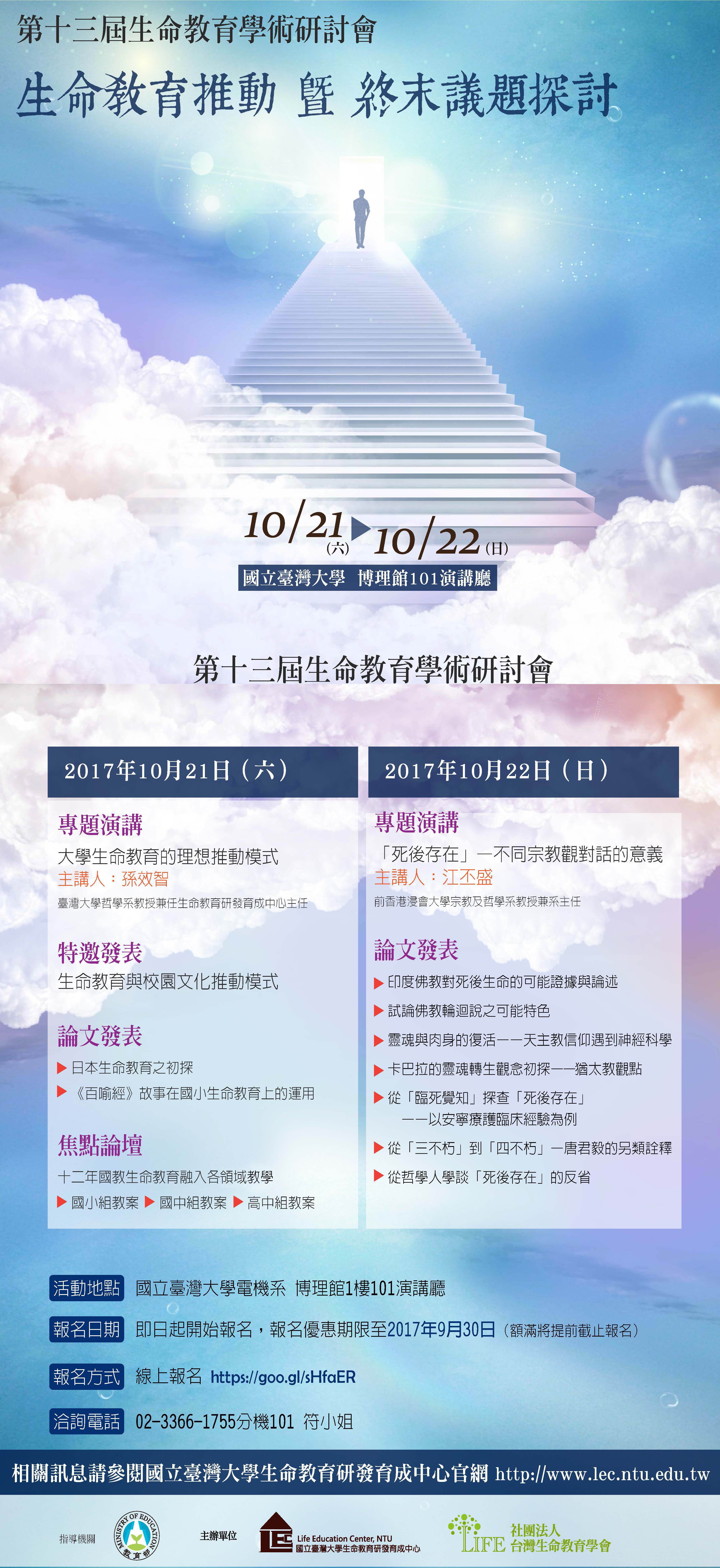 | 2017/09/12 轉知國立臺灣大學「2017年第十三屆生命教育學術研討會」報名資訊 |