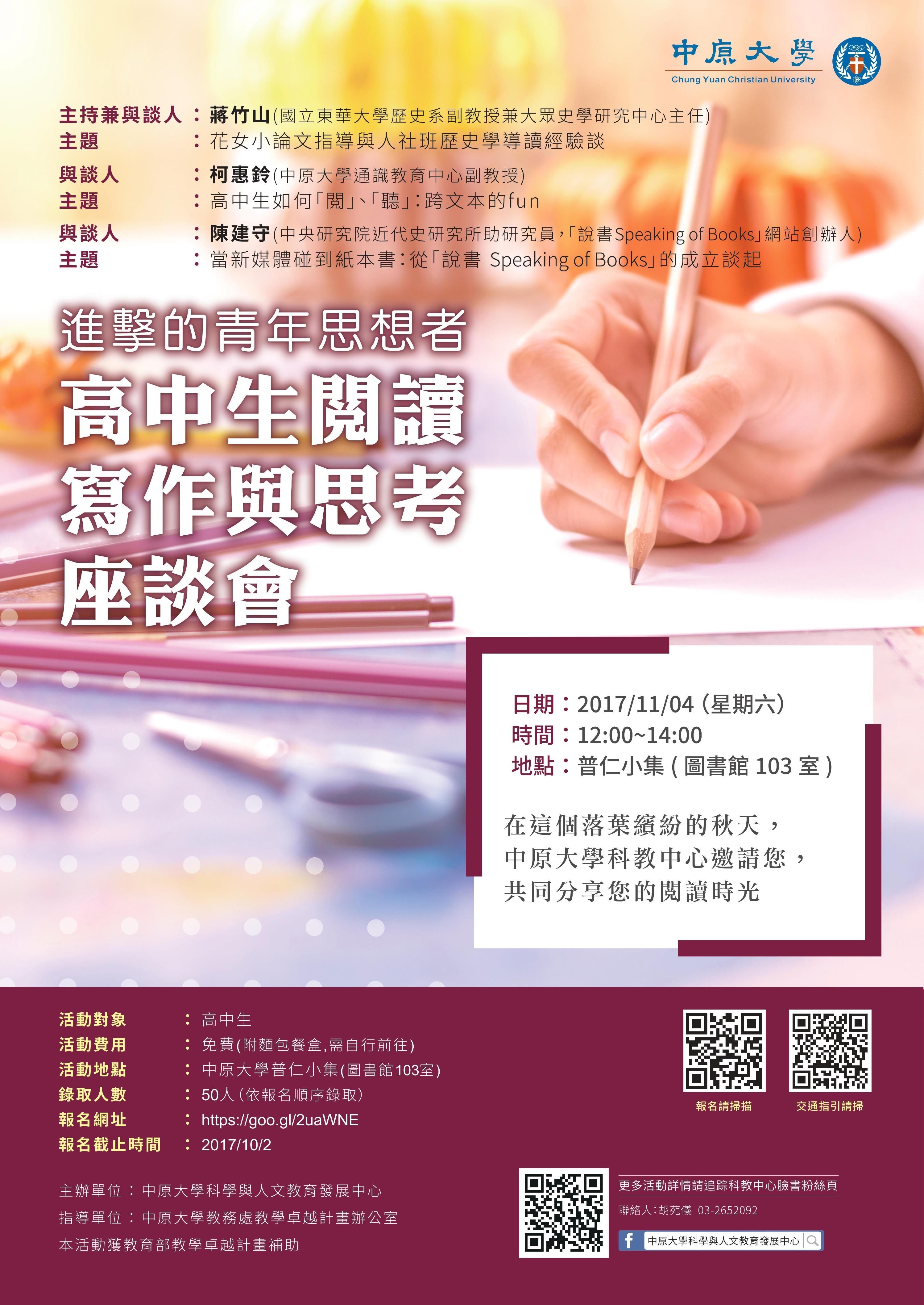 | 2017/10/06 中原大學舉辦「進擊的青年思想者:高中生閱讀、寫作與思考座談會」活動 |
