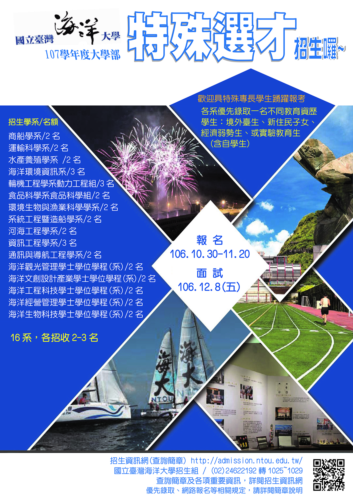 | 2017/10/18 國立臺灣海洋大學107學年度大學部特殊選才招生考試資訊 |
