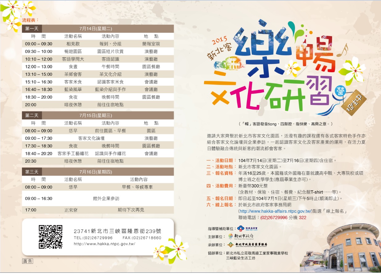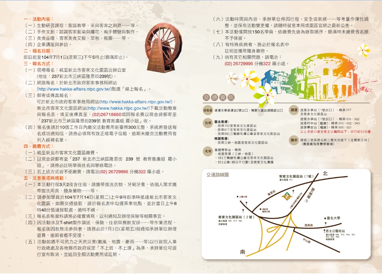 | 2015/05/26 轉知新北市政府客家事務局辦理「2015新北客樂暢營」活動 |
