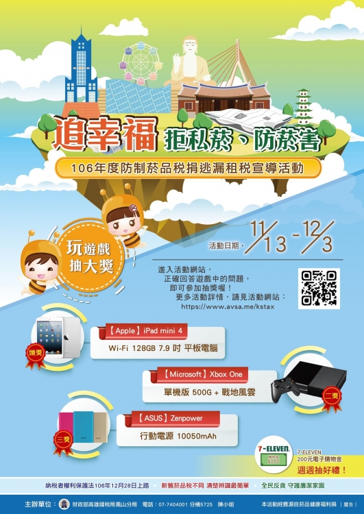 宣導內容:「財政部高雄國稅局鳳山分局【追幸福、拒私菸、防菸害】玩遊戲,抽大獎,等您來挑戰!活動網站https://www.avsa.me/kstax」。
