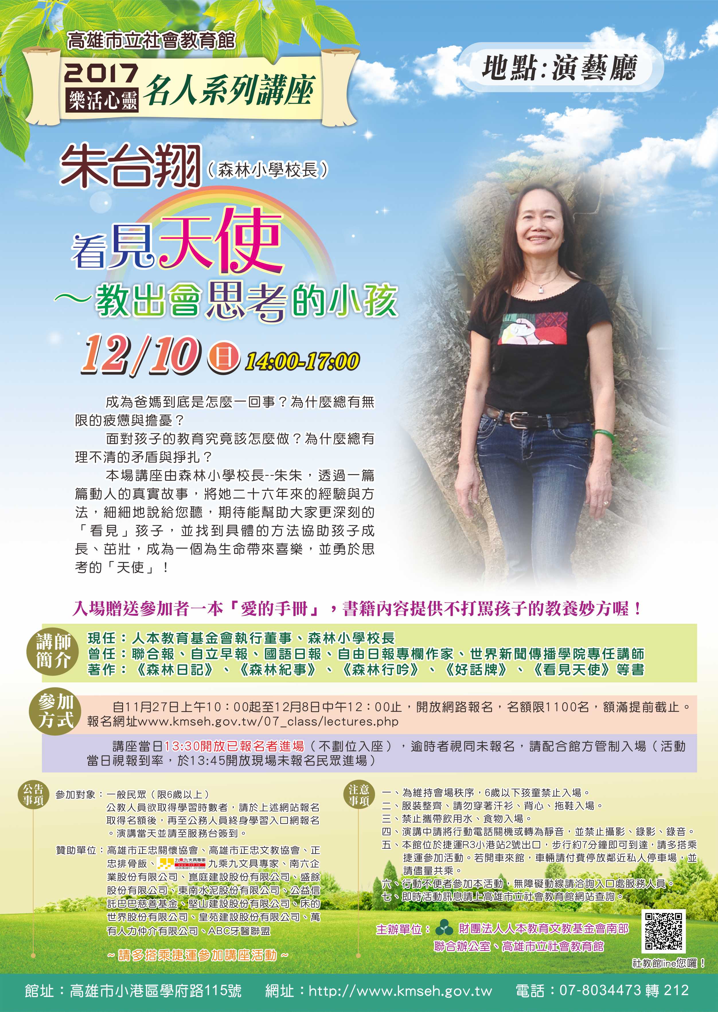 | 2017/11/20 高市社教館講座:12月10日14:00邀請《森林小學校長》朱台翔主講「看見天使~教出會思考的小孩」,採網路報名,詳情請上該館網站查詢 |