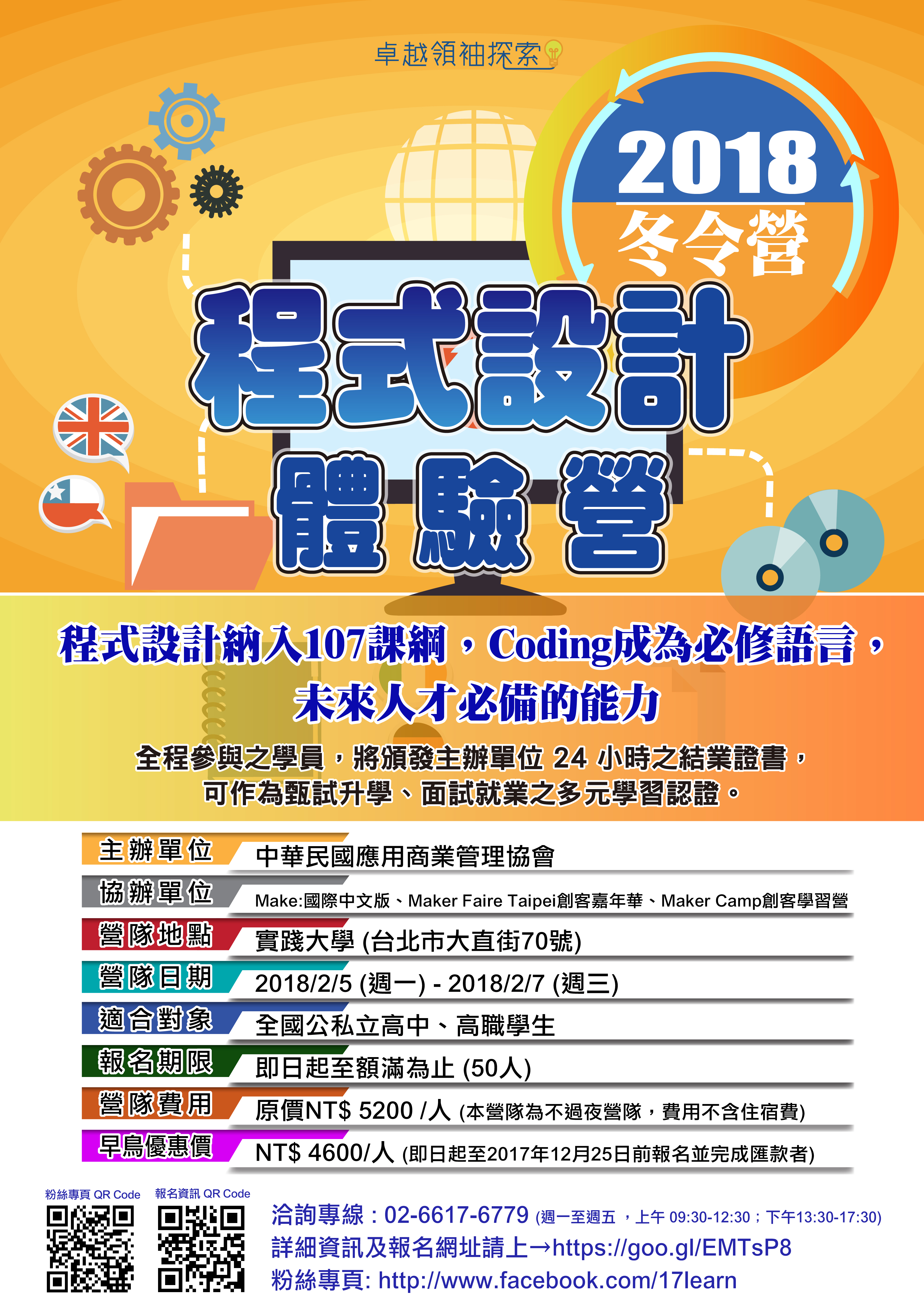 | 2017/11/21 檢送中華民國應用商業管理協會與晴佳國際有限公司共同舉辦「2018年程式設計體驗營」 |