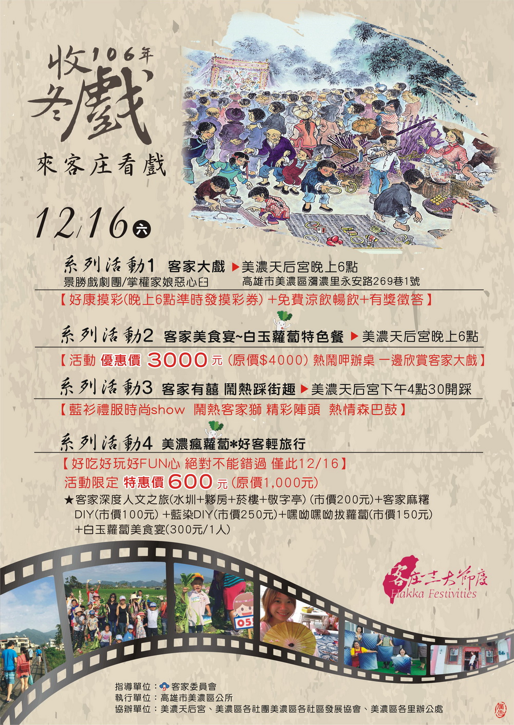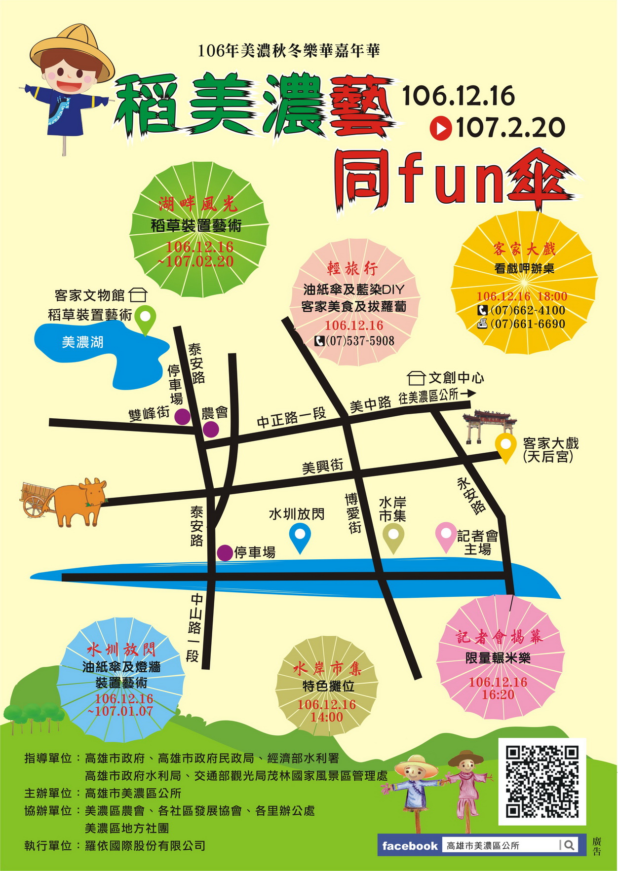 | 2017/11/29 「12月16日美濃秋冬樂華嘉年華開始囉!邀請您走進稻草編製的世界名畫、漫步在油紙傘妝點的水圳邊,這個秋冬,我們『稻』美濃藝同放『傘』吧!活動詳情請上網搜尋美濃區公所臉書粉絲專頁」 |