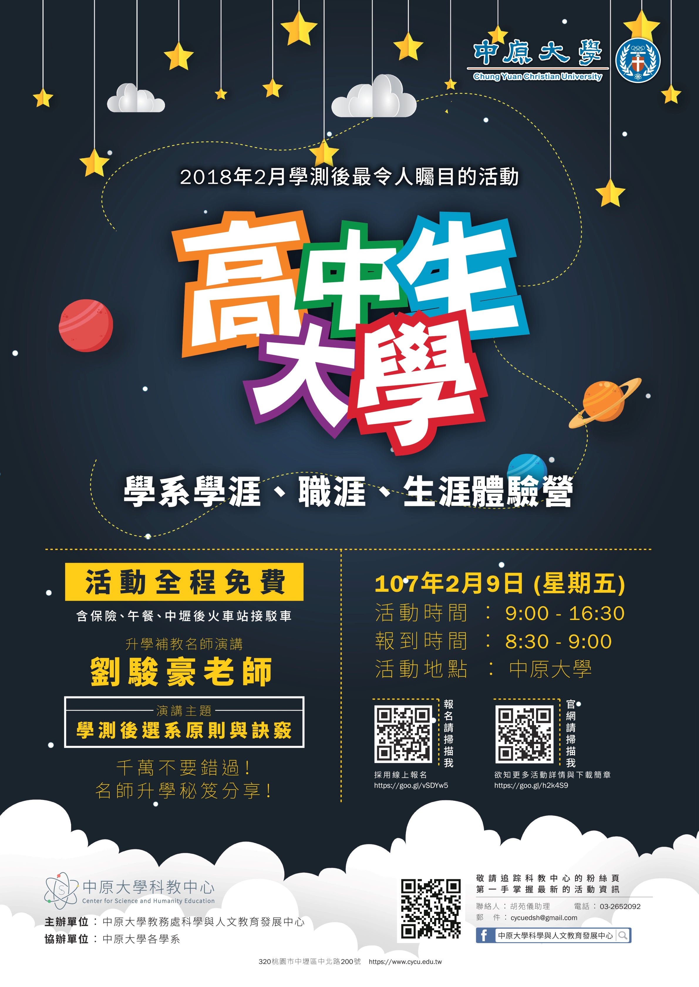 | 2017/12/04 中原大學「2018高中生大學學系學涯、職涯、生涯體驗營」活動 |