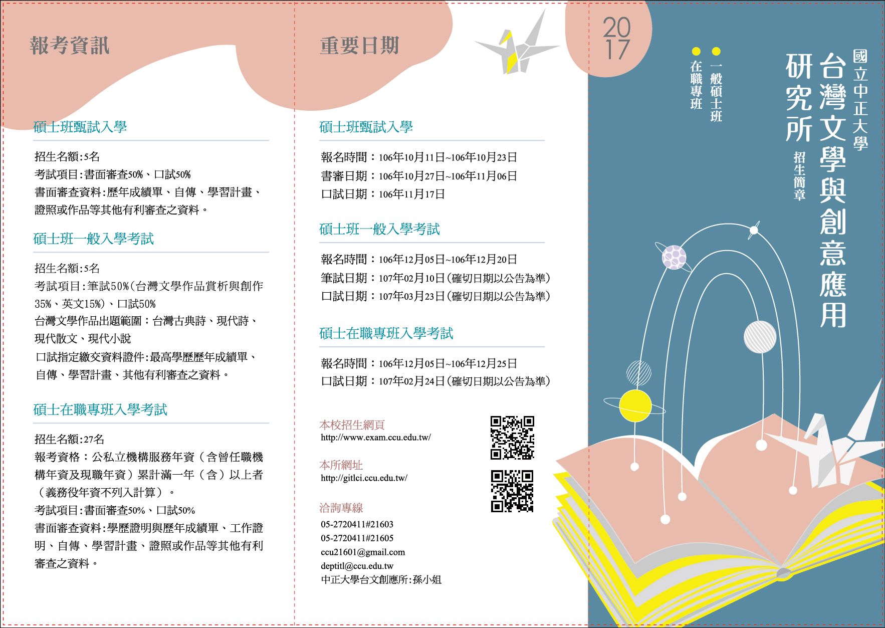 | 2017/12/04 國立中正大學台灣文學與創意應用研究所107學年度碩士在職專班招生 |