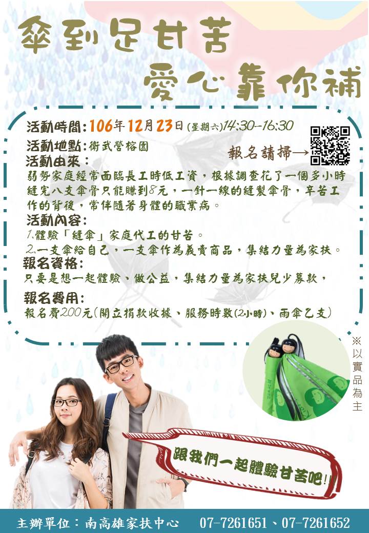 一、南高雄家扶中心致力於弱勢家庭的服務,將於12/23(六)14:30~16:30假衛武營舉辦『甘苦體驗活動』。