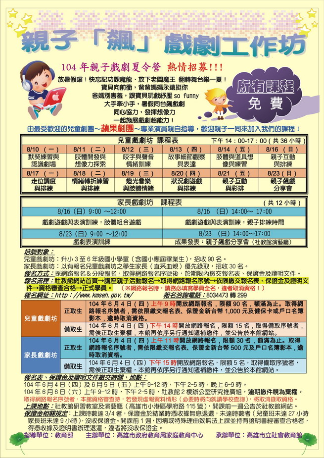 | 2015/05/26 高雄市立社會教育館館辦理「親子飆戲劇工作坊」免費培訓課程,請同學踴躍參與。 |