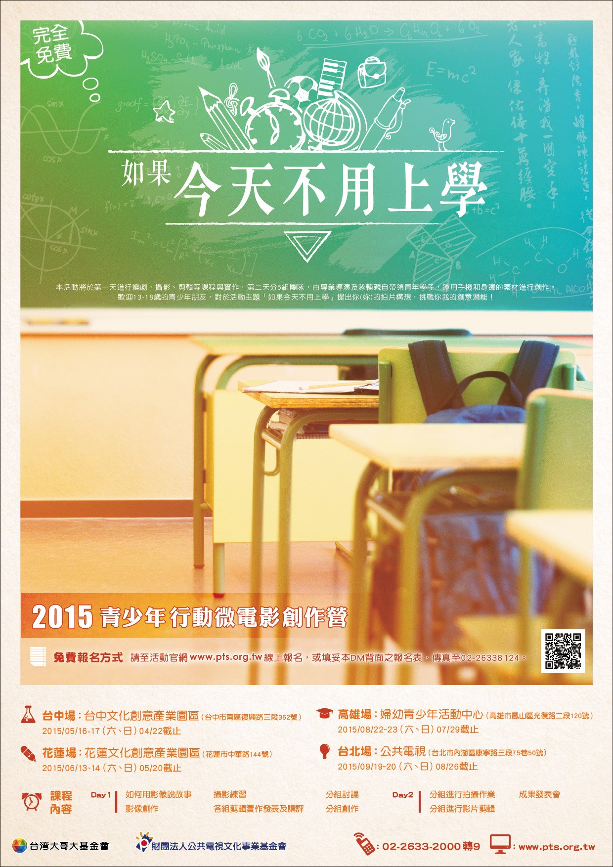 | 2015/05/27 公共電視文化事業基金會辦理「如果今天不用上學」2015青少年行動微電影創作營,請同學踴躍參與。 |