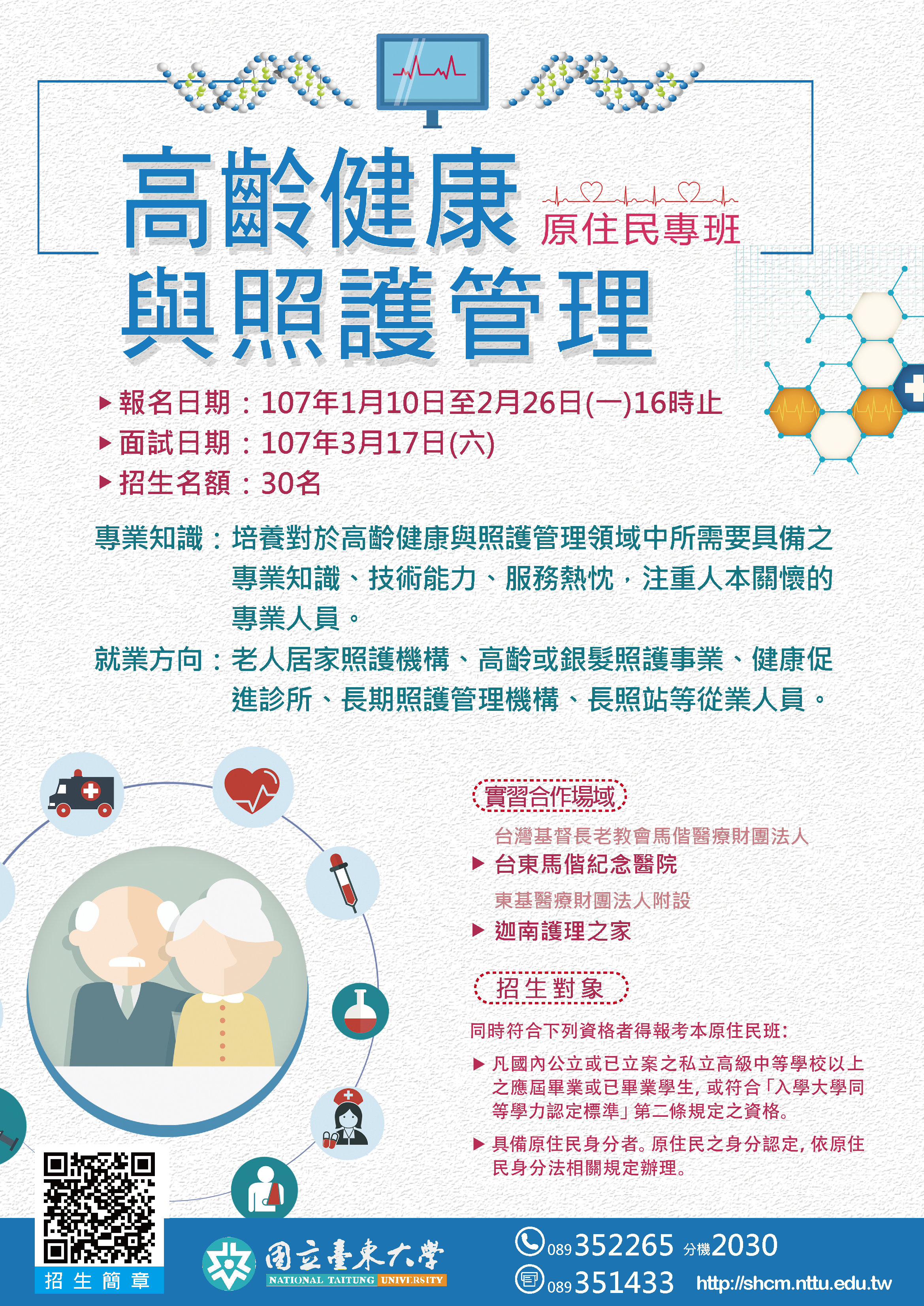 國立臺東大學辦理107學年度「高齡健康與照護管理原住民專 班」招生簡章,請參閱附件。
