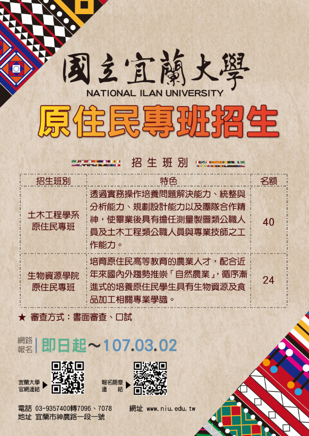 國立宜蘭大學檢送本校107學年度原住民專班招生資訊