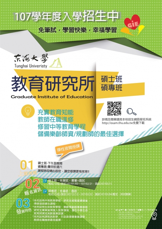 | 2018/01/16 東海大學教育研究所107學年度碩士班、碩士在職專班招生 |