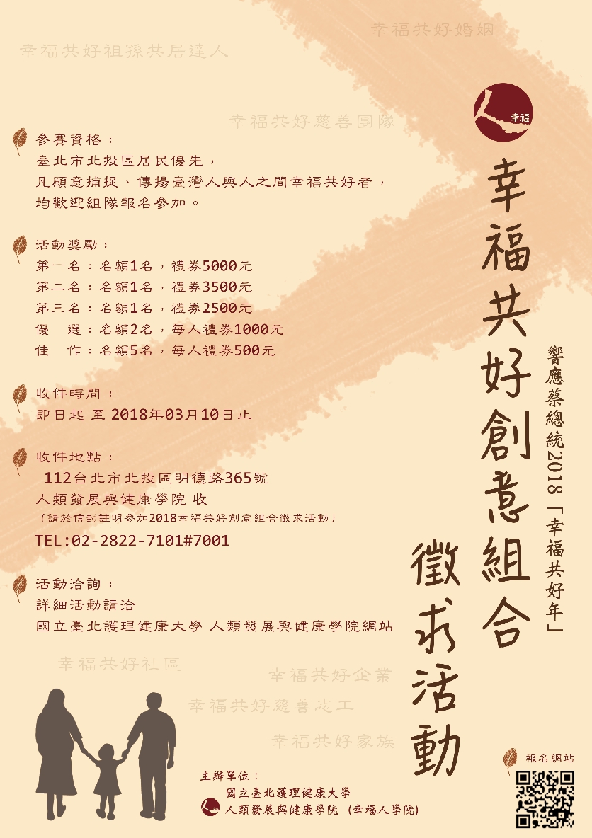 | 2018/02/22 國立臺北護理健康大學人類發展與健康學院《幸福共好創意組合徵求活動》徵稿 |