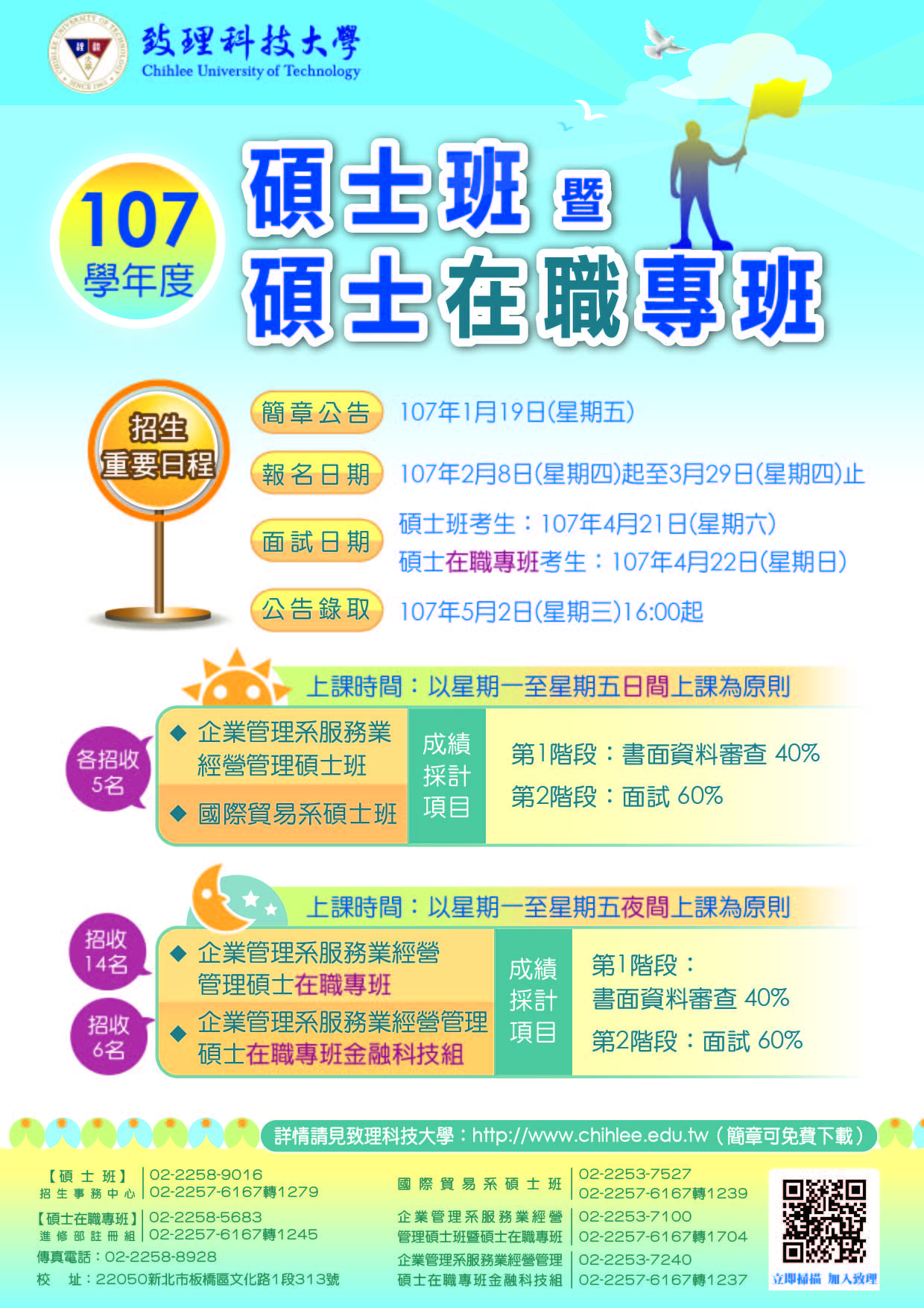 致理學校財團法人致理科技大學107學年度碩士班暨碩士在職專班招生相關資訊,詳附件。