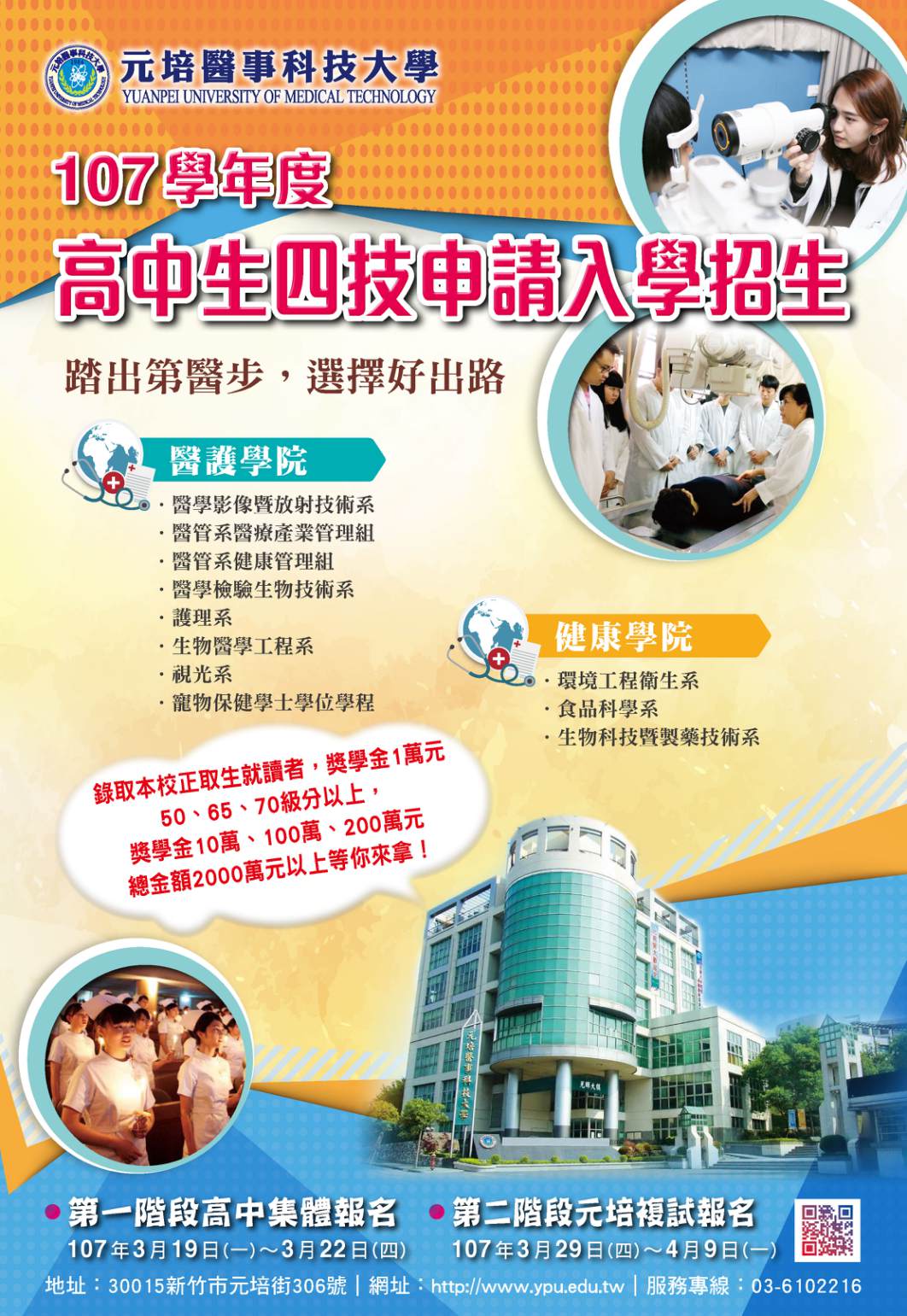 | 2018/03/01 元培醫事科技大學107學年度日間部四技高中生申請入學招生訊息 |