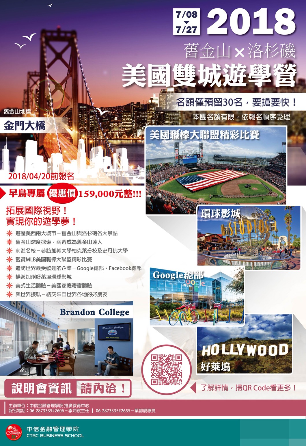 | 2018/04/02 轉知:中信金融管理學院「2018美國舊金山/洛杉磯雙 城遊學營」 |