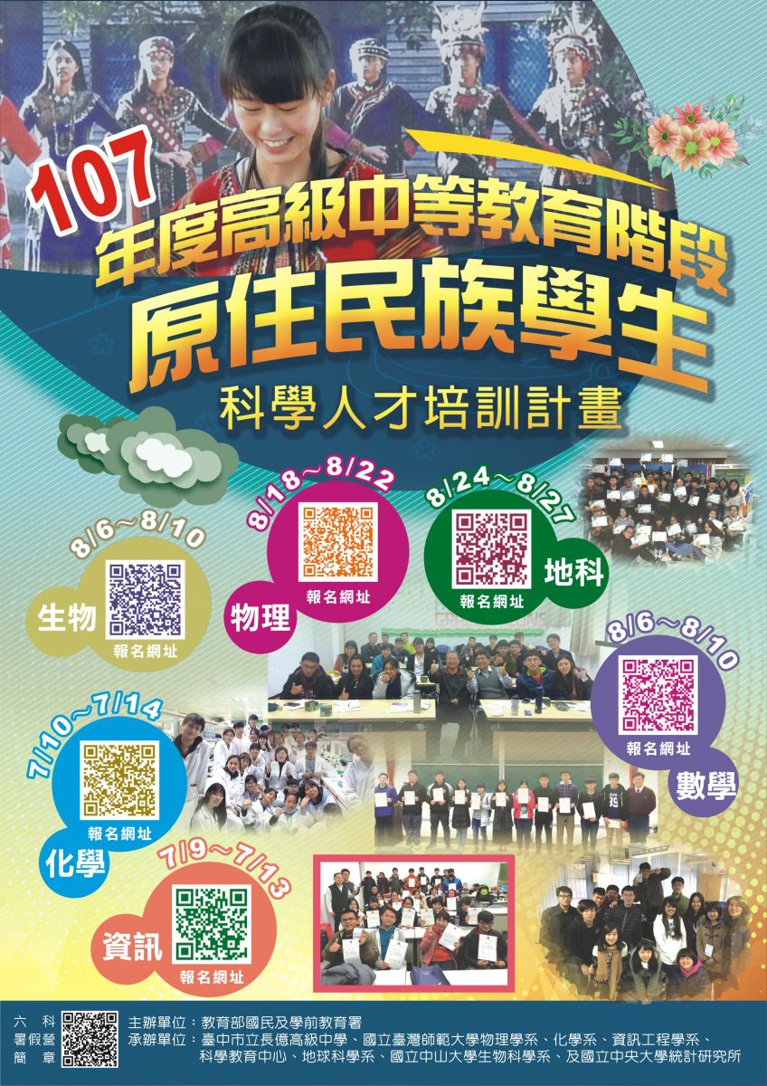 | 2018/05/03 「107年度高級中等教育階段原住民族學生科學人才培訓計畫」之各科暑假培訓營資訊 |