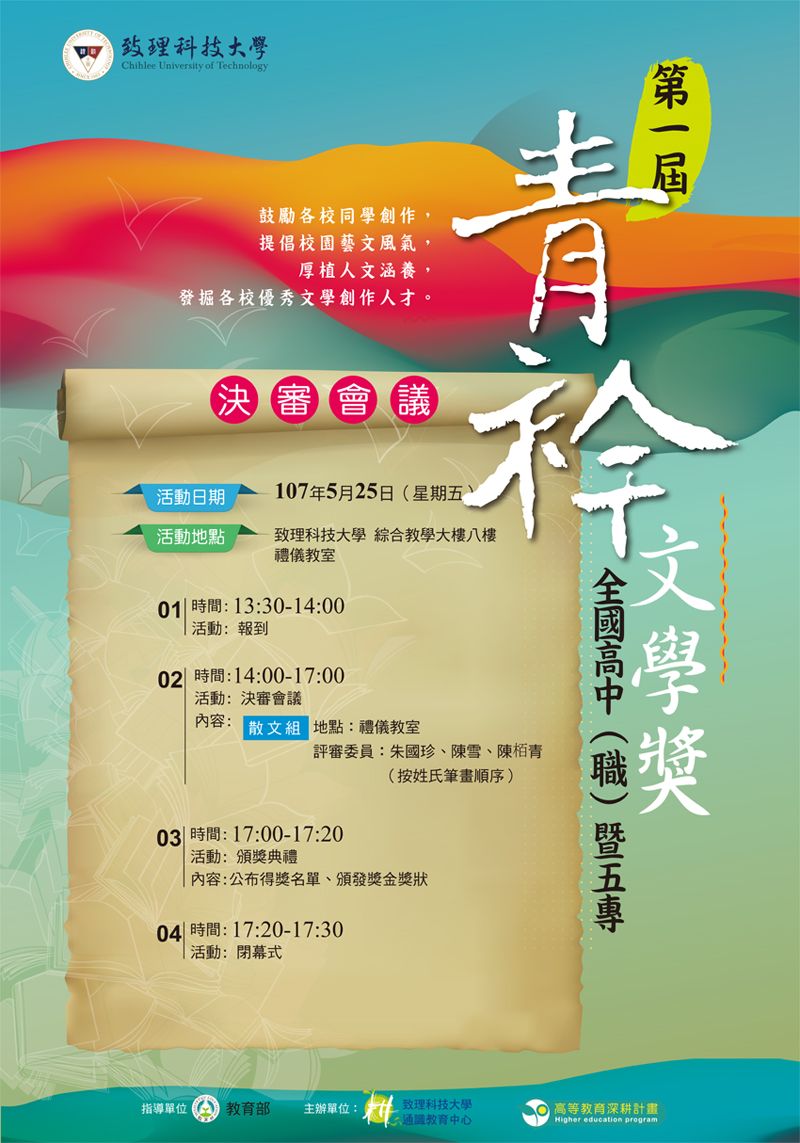| 2018/05/15 轉知致理科技大學於5月25日舉行「第一屆全國高中(職)暨五專青衿文學獎」決審會議 |