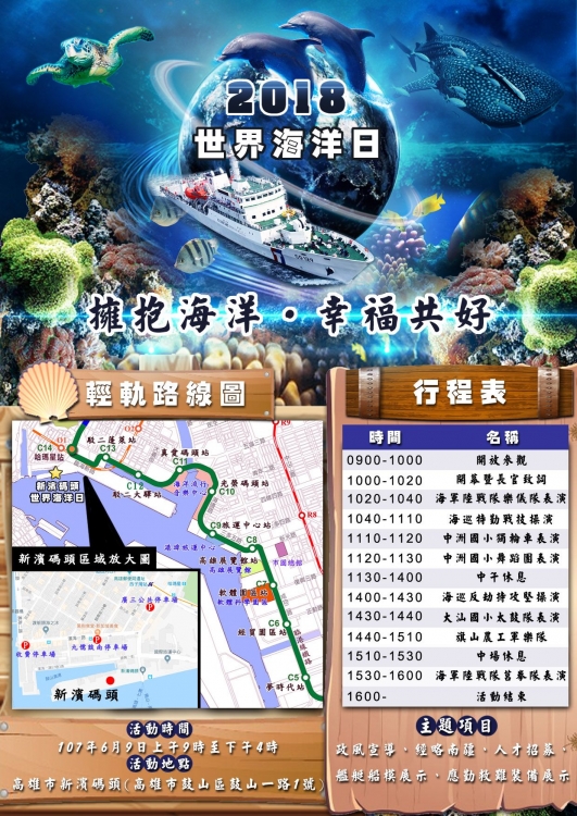 一、行政院海洋委員會海巡署訂於107年6月9日(星期六)上午9時至下午4時假高雄市新濱碼頭(地址:高雄市鼓山區鼓山一路1號)舉辦「2018年世界海洋日」活動,敬邀貴單位及所屬人員踴躍參加,並協助於校園網站、公佈欄、電視牆及跑馬燈系統刊登活動訊息,相關活動流程及交通路線圖如附件。