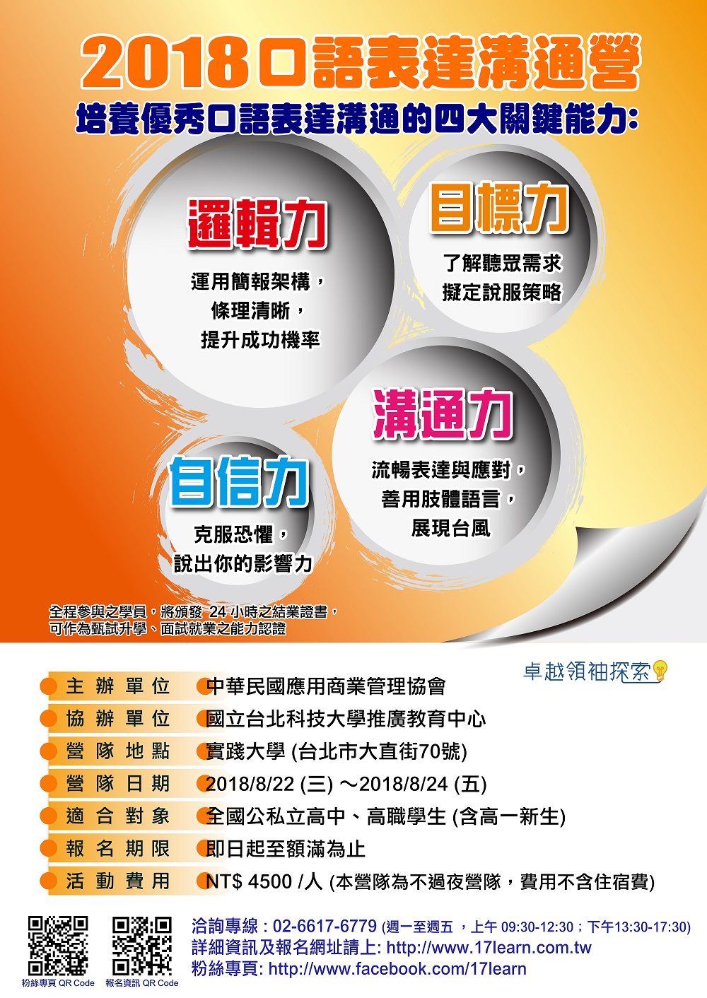 四、營隊目的: 以『做中學(Learning By Doing)』 為理念,透過講解、示範、訓練和不斷的演練,克服公開發言的恐懼,人人都可以成為口語表達的高手!為將來的升學及就業加分!