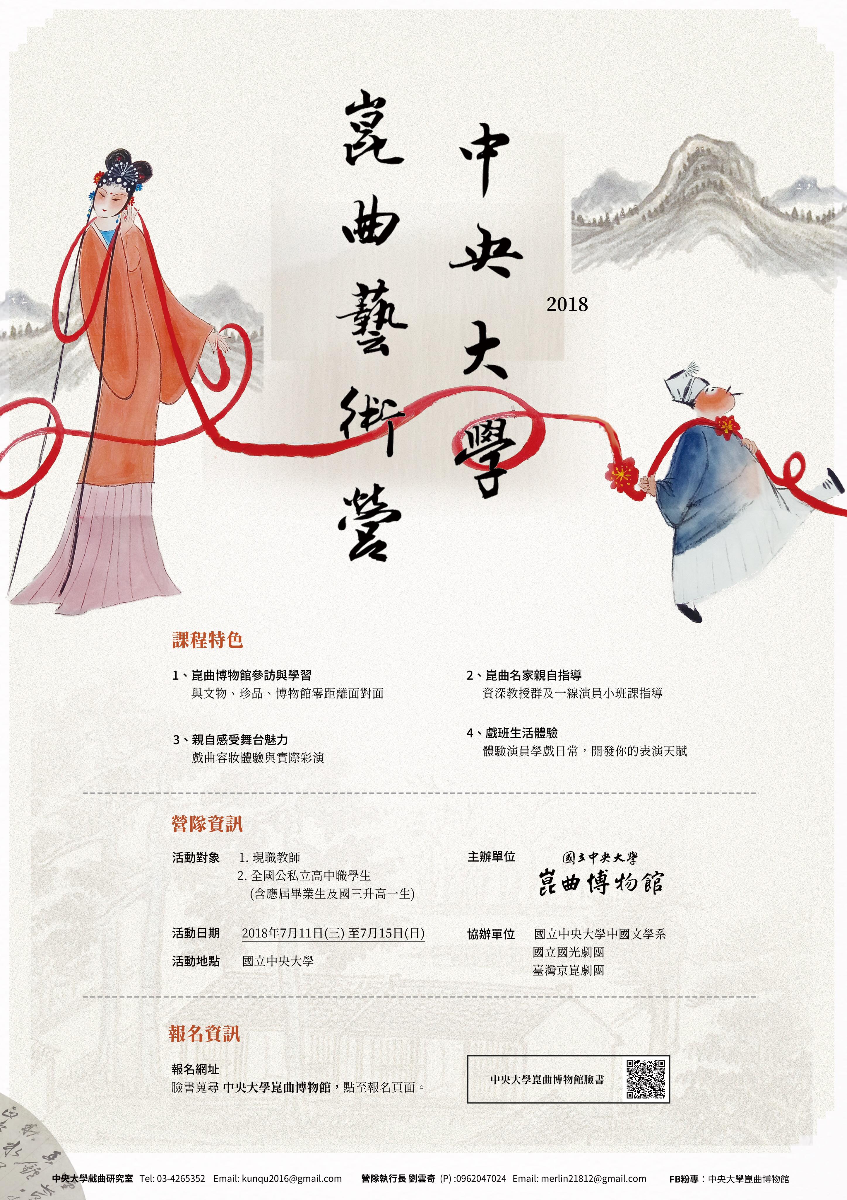 一、崑曲博物館擬於2018年7月11日(三)至7月15日(日)舉辦「2018中央大學崑曲藝術營」。