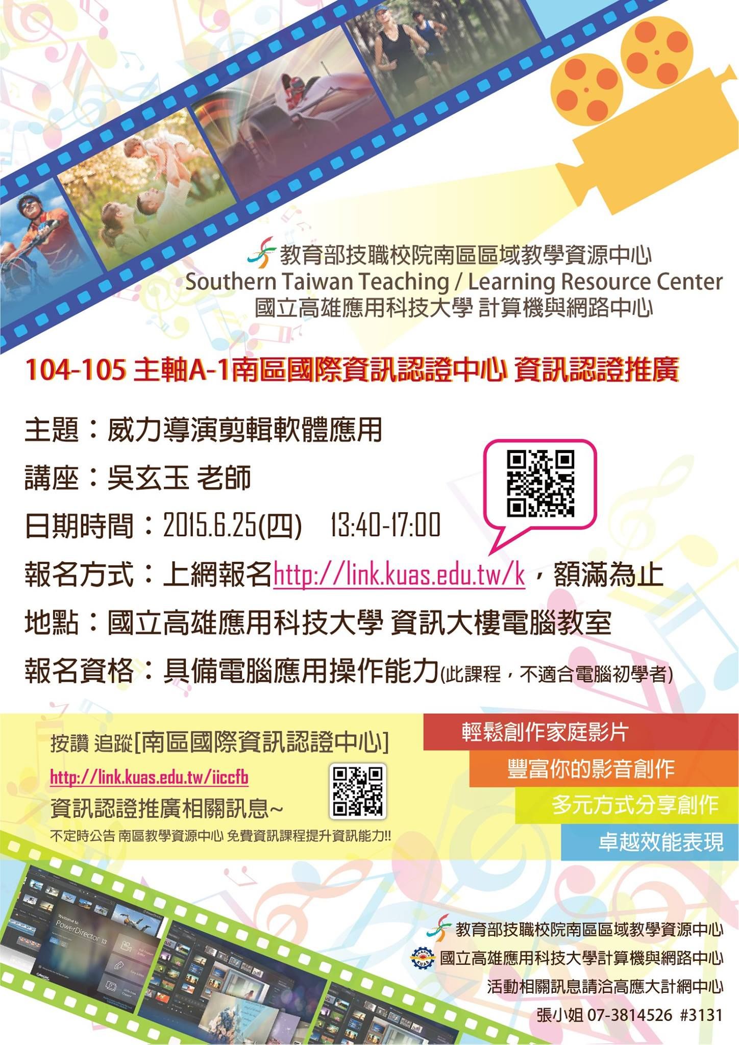 (二)威力導演影片剪輯研習:104年6月25日(四),13:40-17:00,報名網址:http://link.kuas.edu.tw/k。