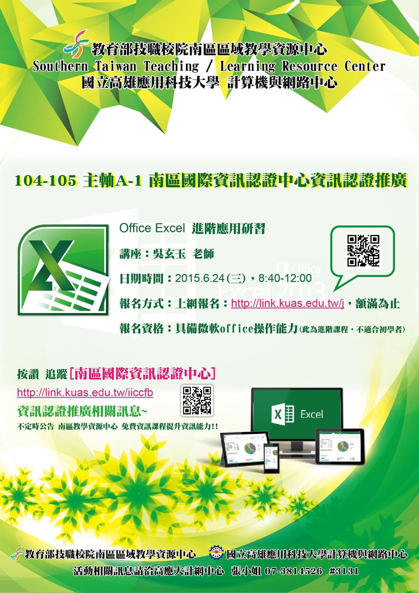 (一)Excel expert研習:104年6月24日(三),8:40-12:00,報名網址:http://link.kuas.edu.tw/j。