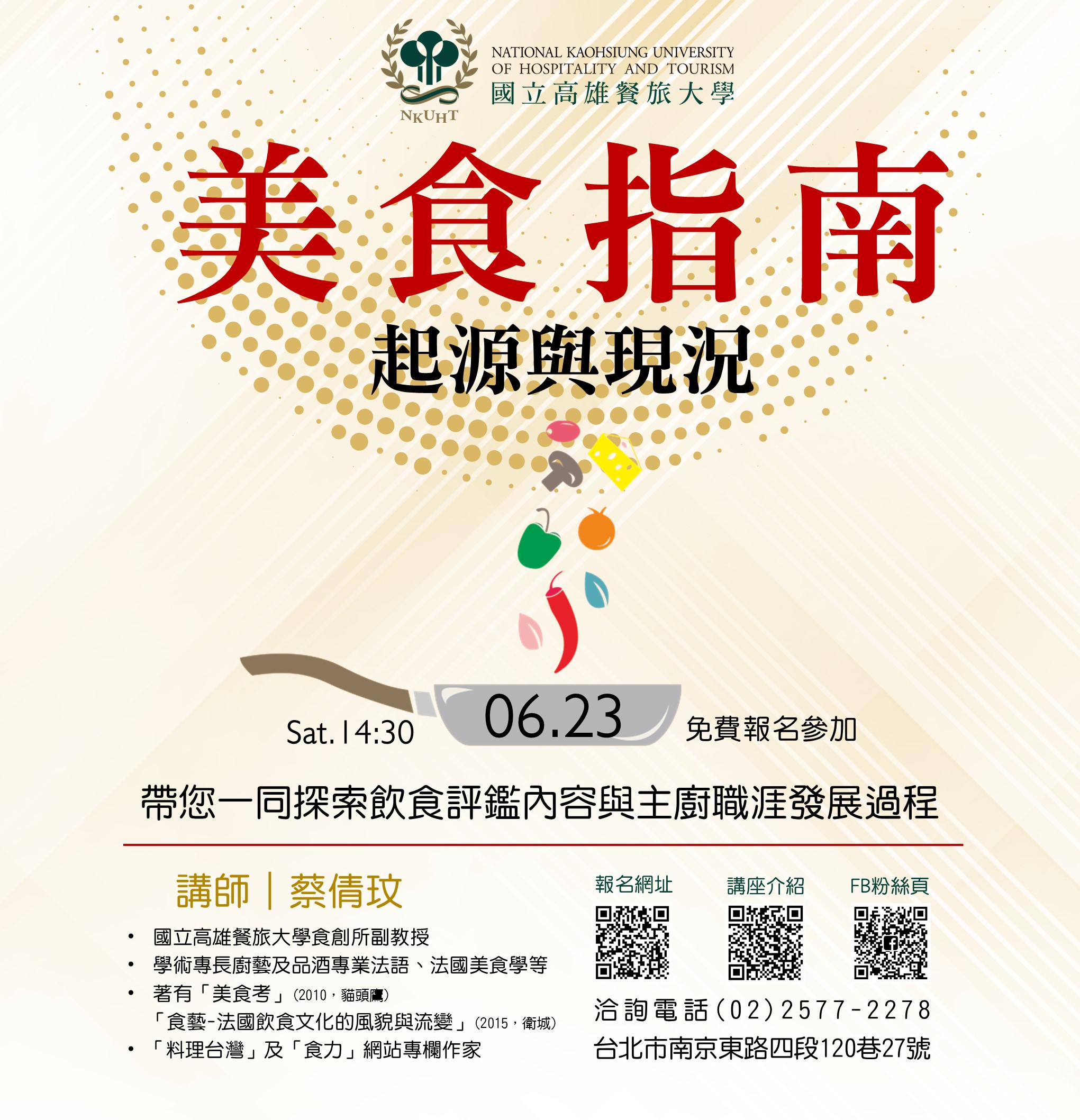 高雄餐旅大學台北推廣教育中心辦理「美食指南的起源與現況」專題講座,,報名資訊詳附件公文。