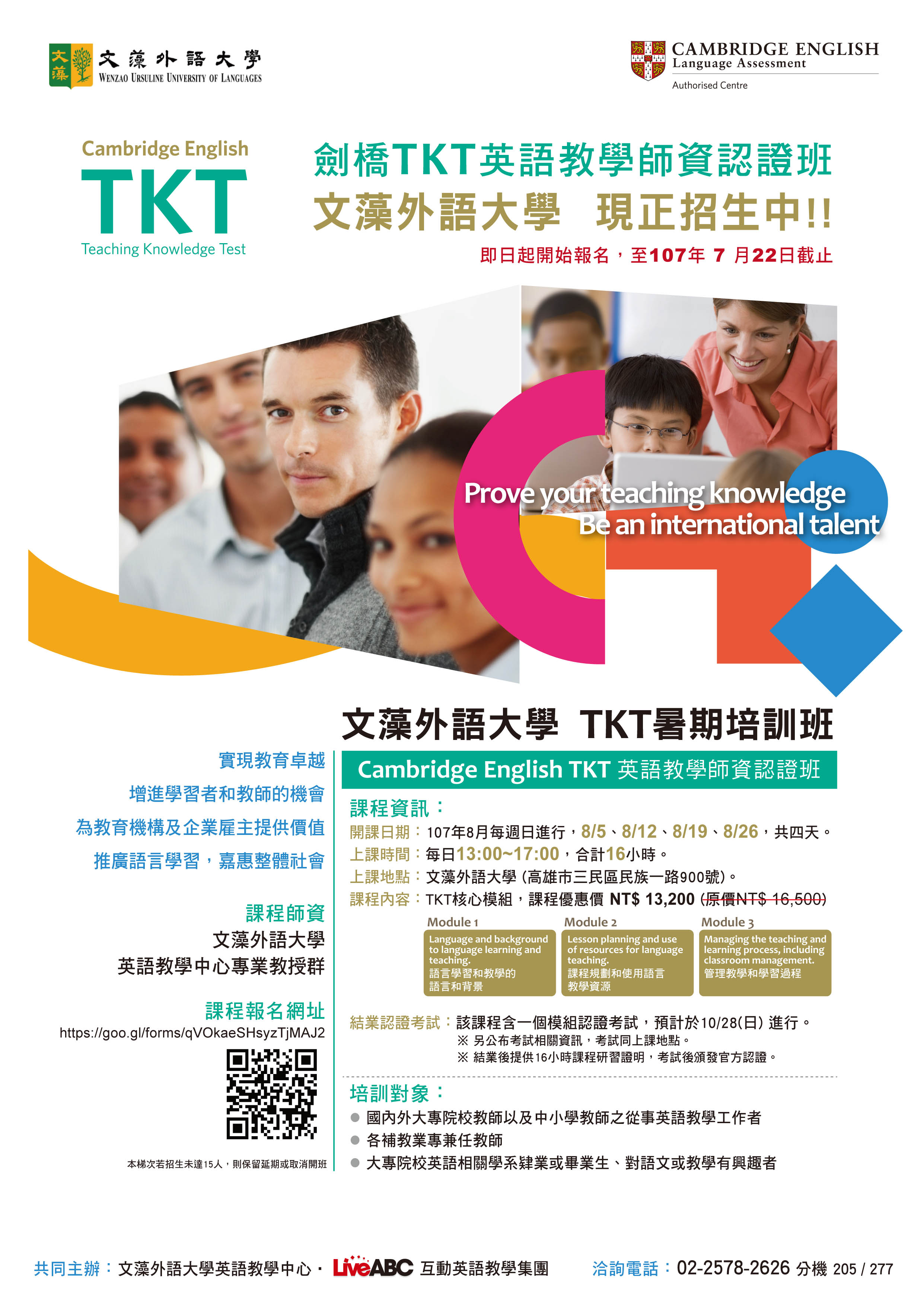 文藻外語大學英語教學中心8月開辦「Cambridge English TKT英語教學師資認證班」暑期培訓招生,,報名資訊詳附件。