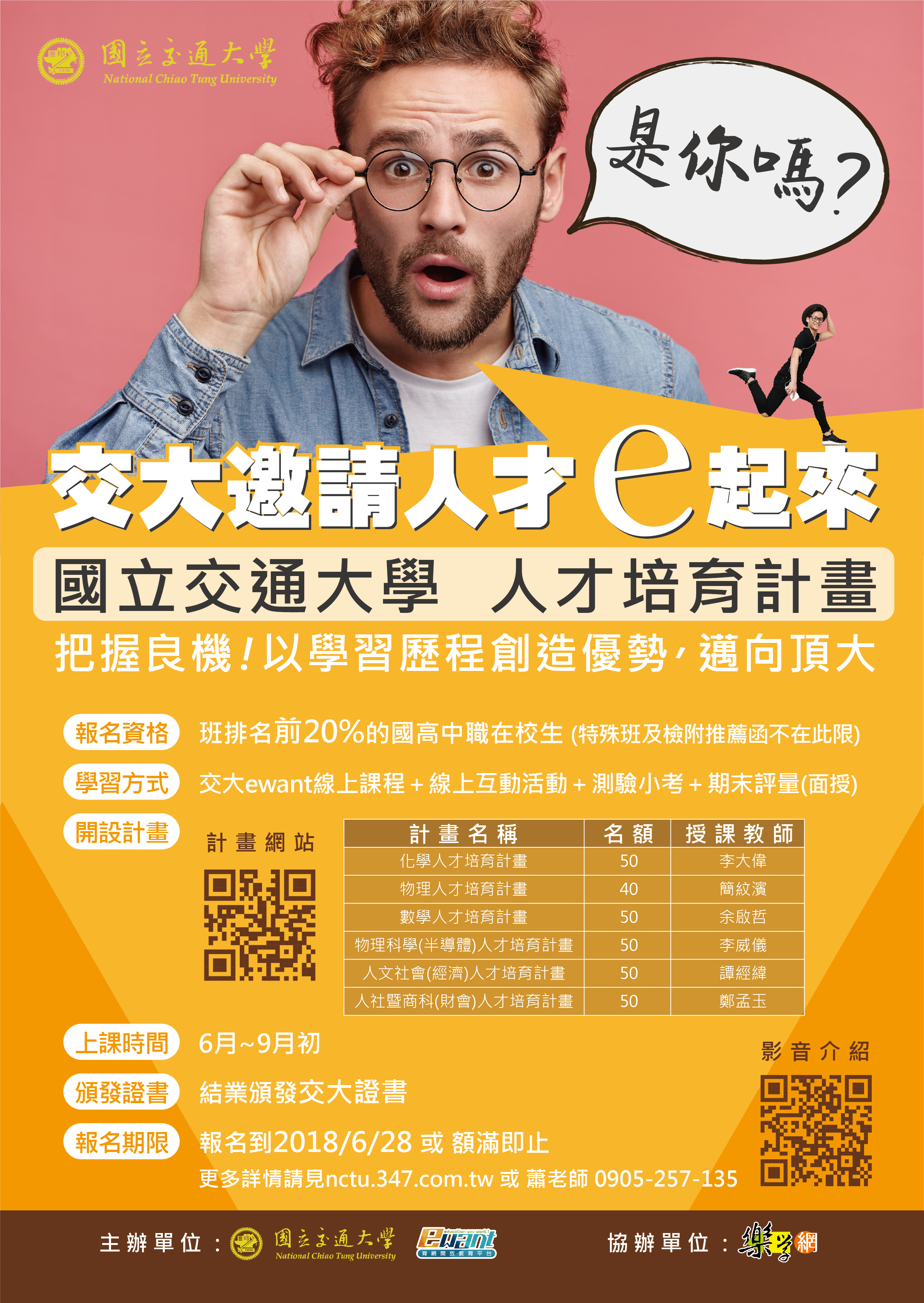 - 預計線上互動與面授日期:107年6月29日至9月8日止。有關本計畫內容、課程大綱與報名方式,請至交通大學中學人才培育計畫網站查詢(網址:https://nctu.347.com.tw)。